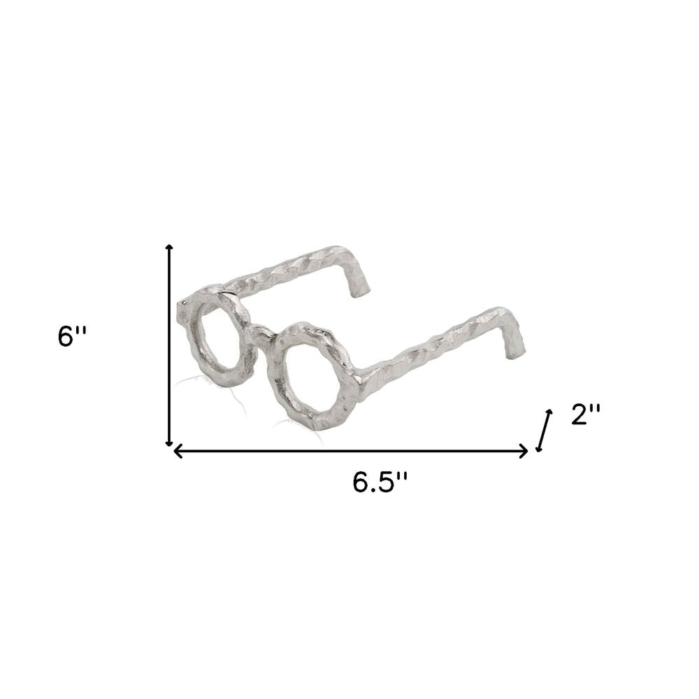 Bring some sizzle to your space with this eye-catching 7-inch silver aluminum textured round eyeglasses tabletop sculpture. This silver colored piece is made from high grade buffed aluminum that is full of texture and detail. This unique sculpture has a modern vibe with a touch of whimsy that makes a great tabletop accent for your coffee table, counter, bookshelf, mantle, or desk. It's a perfect addition for those who love an up-to-the-minute look and feel. 2-inch h x 6.5-inch w x 6-inch d.