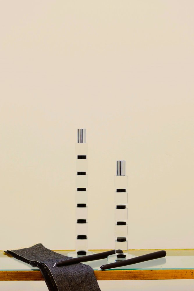 7" Silver Clear And Black Block And Cylinder Crystal Tabletop Taper Candlestick