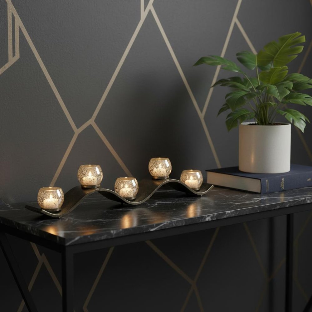 Create a warm and inviting environment in any space with this 7-inch silver distressed abstract metal and glass tabletop hurricane candle holder. Handmade by skilled craftsmen and designed to add a glamorous glow to any event or table setting. Dress up your home to impress every season with this fabulous candleholder. Candleholders are an attractive way to turn a simple candle into a piece of décor. 6.99-inch h x 37-inch w x 4.92-inch d.