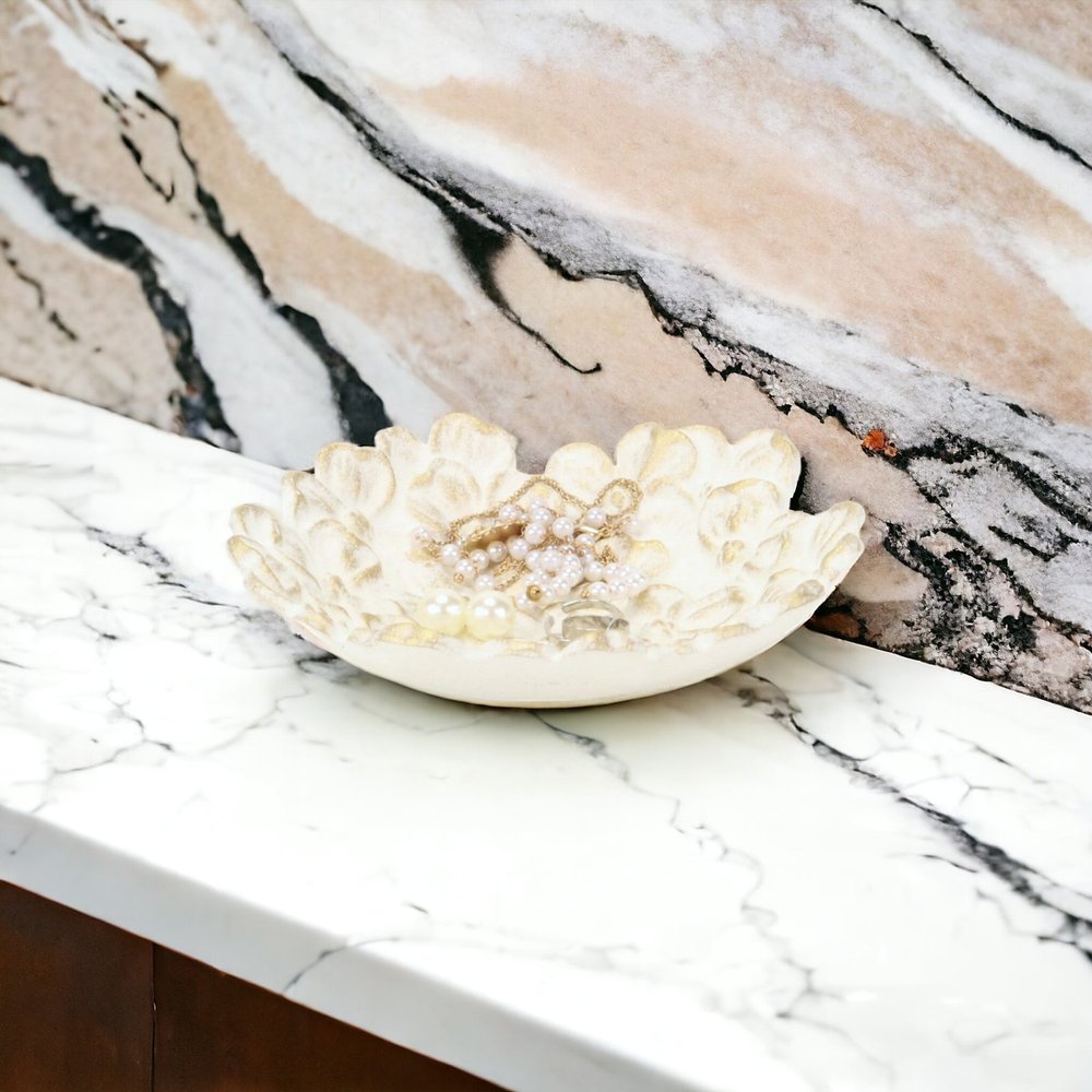 Crafted from premium cast iron, this trinket tray showcases a unique dimensional flower shape that adds whimsy to any decor. The modern style is enhanced by a beautiful rustic white with gold brush finish, making it a versatile addition to your home. Each piece is meticulously handmade, ensuring that it is not only functional but also a work of art. The rough hewn distressing gives it a charming, vintage appeal, allowing it to blend seamlessly with both contemporary and traditional interiors. Use it as a stylish catch-all on a tabletop or a lovely addition to your vanity for an inviting look. 1.625-inch h x 7-inch w x 7-inch d.