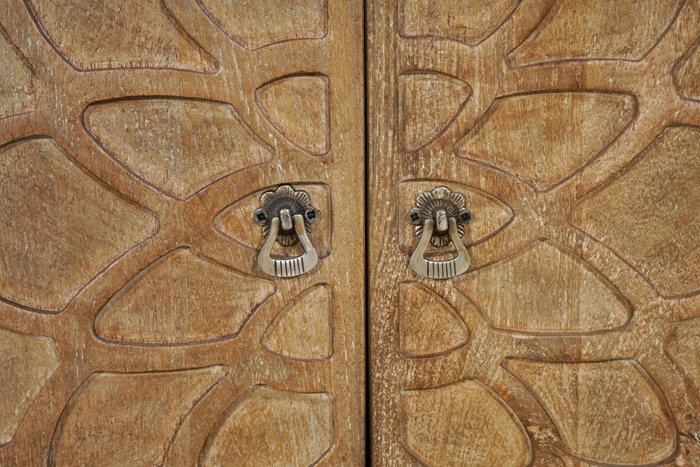 Storage vessels don't have to be unsightly. Increase your storage space and the fashion quotient of your room with this hard wearing, versatile, and good looking cabinet. Crafted from solid wood, this sideboard showcases a rustic charm that complements any decor. The beautifully carved floral detailing on both the doors and the surface adds an artistic touch. It features spacious shelves for ample storage, ensuring functionality meets style. The rich brown finish with a slight whitewash and distressing enhances the natural grain of the wood, while the brass hardware provides an elegant accent to its overall design. 38.00-inch h x 70.00-inch w x 18.00-inch d.