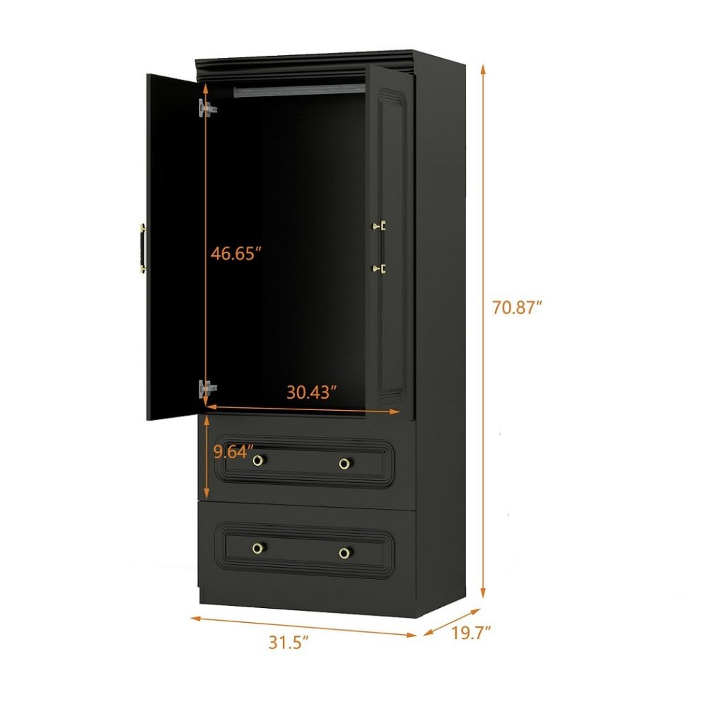 This 71-inch black wood two door two drawer combo dresser is a practical and good looking accent for your bedroom storage and organizational needs. Versatile in use, this combo dresser is equipped with both drawers and doors for all your storage needs. This dresser is made from sturdy manufactured wood that is built to last. The black coloration of this piece gives it an updated, and modern edge. 70.87-inch h x 31.5-inch w x 20.67-inch d.