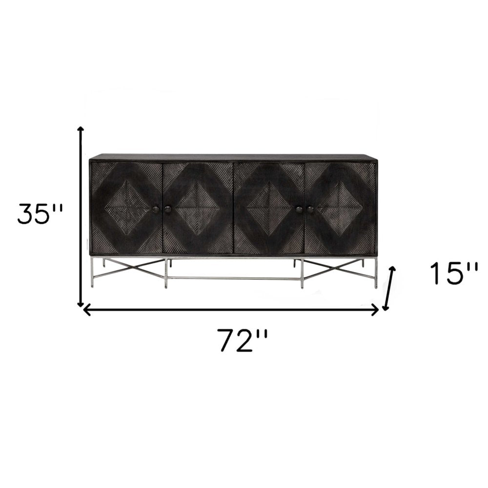 Storage vessels don't have to be unsightly. Increase your storage space and the fashion quotient of your room with this hard-wearing, versatile, and good-looking black solid wood sideboard. Featuring shelves and door included, this contemporary piece exudes style while providing ample storage opportunities for your belongings. Crafted from solid wood, this sideboard is not only durable but also adds a touch of sophistication to your living space. A perfect combination of functionality and aesthetics, this sideboard will effortlessly complement your existing decor with its sleek design. 35-inch H x 72-inch W x 15-inch D