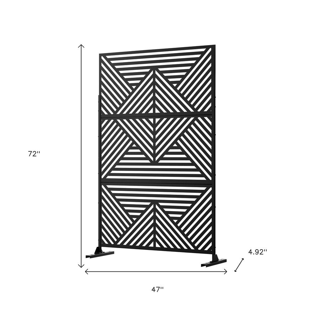 The 72-inch black steel three panel screen room divider offers a stylish solution for dividing spaces in your home or outdoor area. Crafted from durable metal, this room divider combines strength and elegance with its sleek steel screen material. Designed with three panels, it provides flexibility in configuring your space while maintaining a translucent opacity that allows light to filter through. This versatile piece enhances privacy and creates distinct areas within a room or outdoor setting. Its sturdy construction makes it suitable for various uses, whether you're organizing a living area or adding a decorative touch to your garden. Elevate your interior design with this functional and modern room divider that complements any decor style. 72.00-inch h x 47.00-inch w x 4.92-inch d.