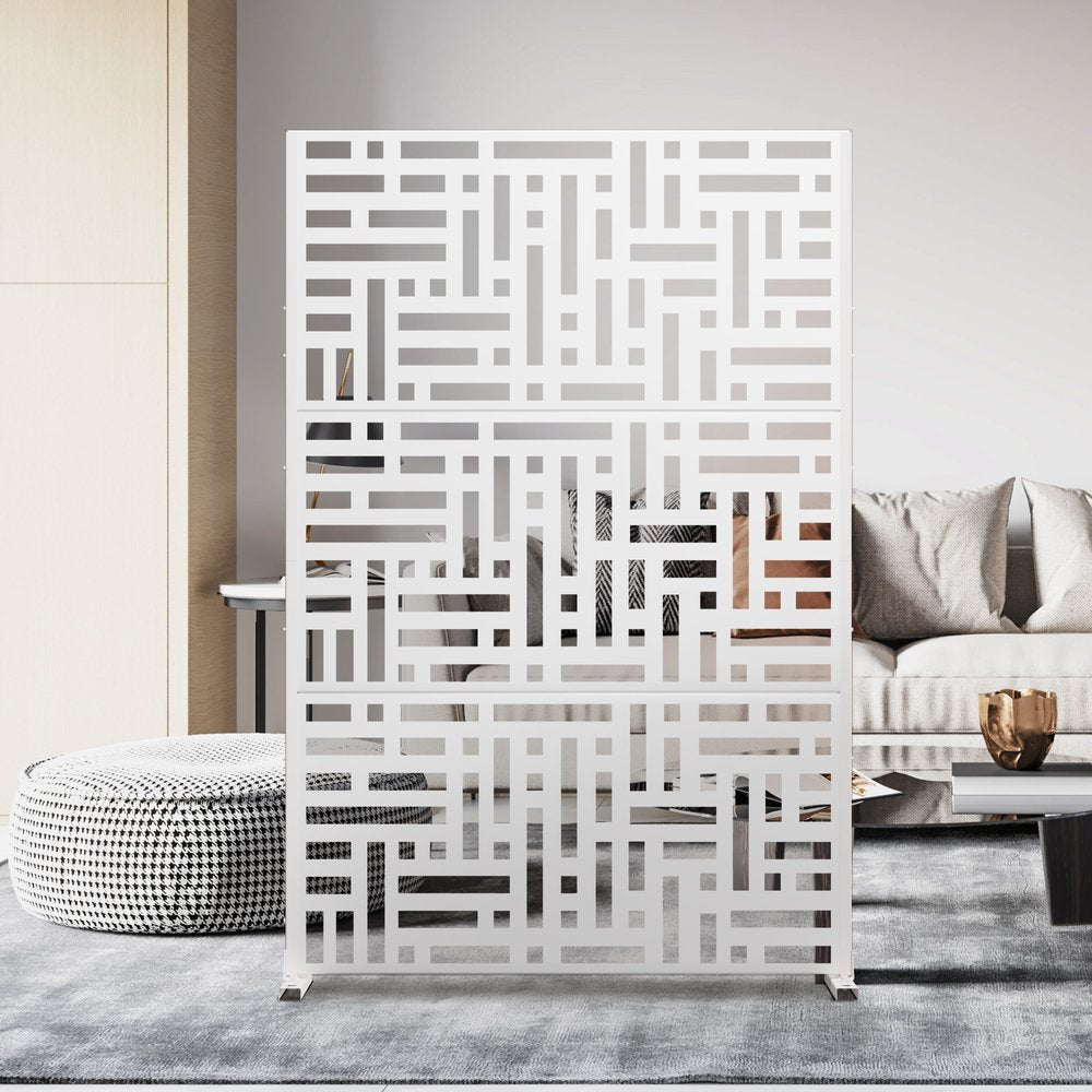 The 72-inch white steel three panel screen room divider is a stylish and functional solution for creating privacy in your space. Crafted from durable metal, this room divider offers a modern touch while ensuring strength and stability. Its translucent steel screen allows light to filter through, providing an airy feel without sacrificing separation. Perfect for both indoor and outdoor use, it enhances versatile living spaces and gatherings. With three panels, it can be easily adjusted to fit various layouts and needs, making it an ideal choice for any home or office setting. This elegant piece not only serves as a divider but also adds an artistic element to your decor. 72.00-inch h x 47.00-inch w x 4.53-inch d.