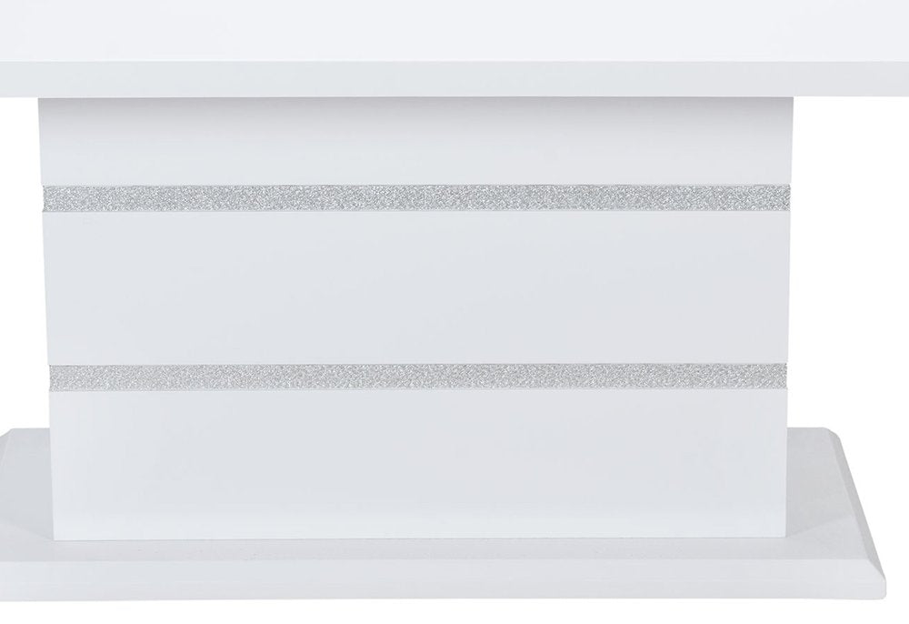 Stylish and super sturdy, the 79-inch white faux crystals glass and wood pedestal base dining table is an amazingly good-looking dining table that was made to become the centerpiece of your dining room. This table features quality construction from manufactured wood, faux crystal glass and acrylic with a chic white and silver glitzy color combination. A pedestal base that adds some depth and interest to your space. This eye-catching dining table is ready for you to enjoy everyday or for entertaining guests. 30.7-inch h x 78.7-inch w x 39.4-inch d.