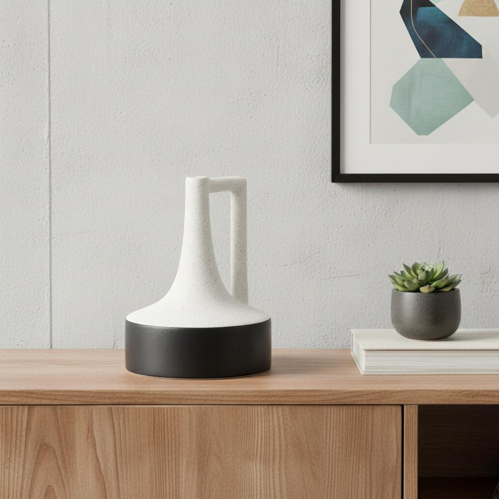 Get ready to accent your space in style with this 8-inch black and white ombre ceramic jug vase. This stunning jug vase features a unique ombre design that seamlessly blends two contrasting colors, creating a visually striking effect. Crafted from high-quality ceramic, it promises durability while enhancing the aesthetic appeal of your home decor. Its versatile design makes it perfect for holding fresh flowers or as a standalone decorative piece. The 8-inch height allows it to fit effortlessly on shelves, tables, or mantels, adding an elegant touch to any room. Elevate your interior design with this chic and functional vase. 8.27-inch h x 6.10-inch w x 6.10-inch d.
