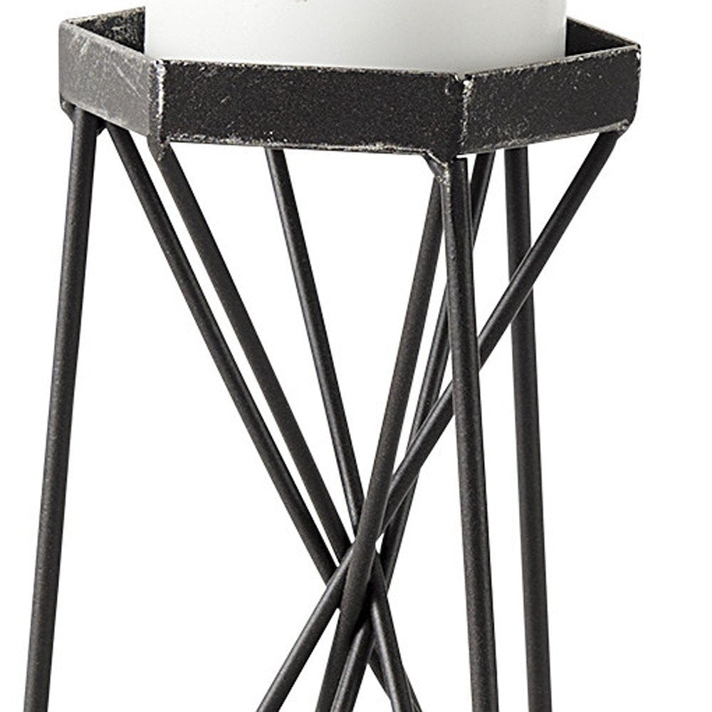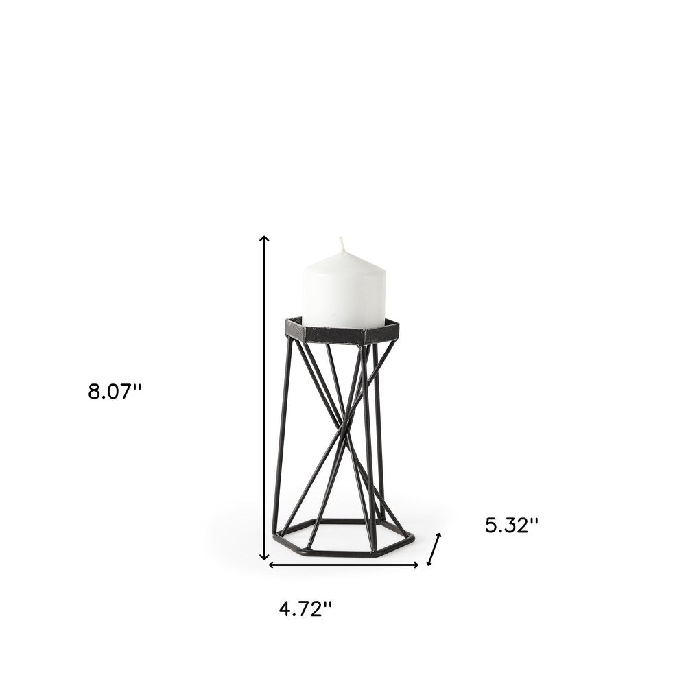 This 8-inch black distressed geometric metal tabletop dish candle holder will add a touch of elegance to your special event, home decor or romantic dinner while creating a subtle and warm ambiance. Handmade by skilled craftsmen and designed to add a glamorous glow to any event or table setting. Dress up your home to impress every season with this fabulous candleholder. Candleholders are a decorative accent on their own. With our without candles. 8.07-inch h x 4.72-inch w x 5.32-inch d.