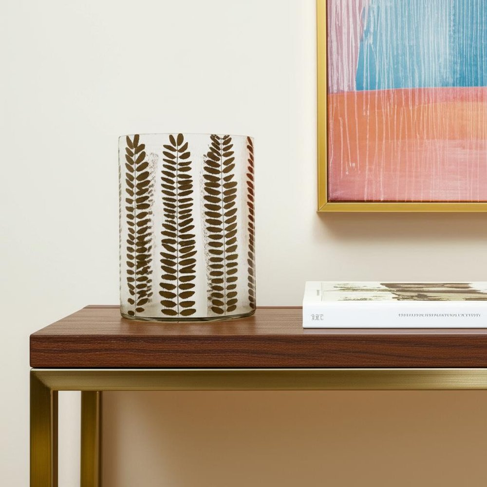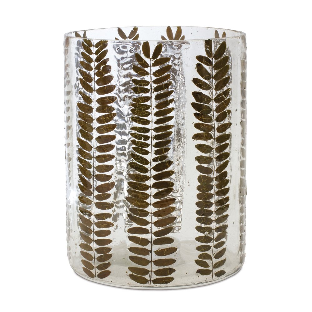 Bring the romantic glow of candlelight to your tabletop with this 8-inch clear and green botanical leaf glass tabletop pillar candle holder. Add an extra pop of personality to every corner of your home with this gorgeous candleholder. Crafted from high-quality glass, it showcases a stunning dried botanical leaf design that elevates any space. Ideal for votive candles, this machine-made piece seamlessly combines style and functionality while enhancing the ambiance of your living area. 8.00-inch h x 6.00-inch w x 6.00-inch d.