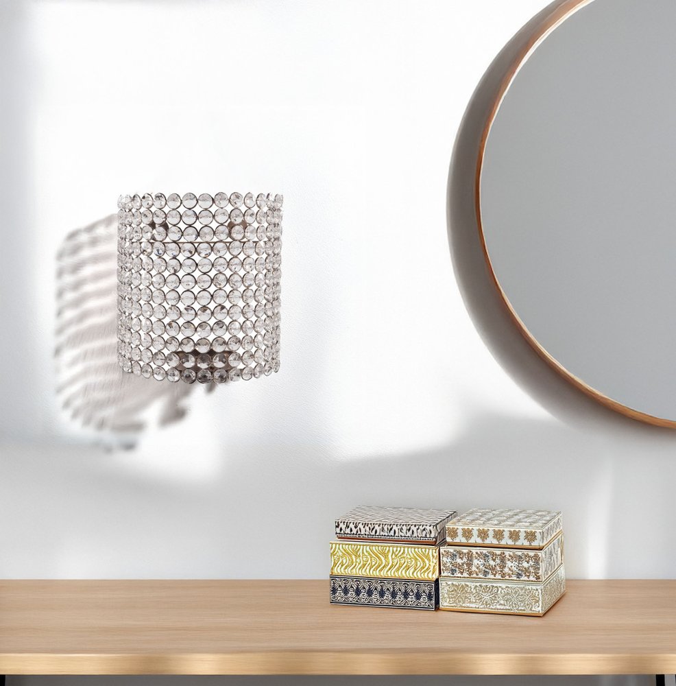 This 8-inch clear and silver bejeweled crystal wall sconce candle holder is a stylish choice to bring ambient illumination to any living space. This fabulous wrap around hanging wall sconce adds a luxurious and glam touch to your space with or without a lit candle. Handmade by skilled craftsmen and designed to add a sparkling and glamorous warm glow to your dining room, living room, hallway, or bedroom. 8.25-inch h x 7.75-inch w x 5-inch d.