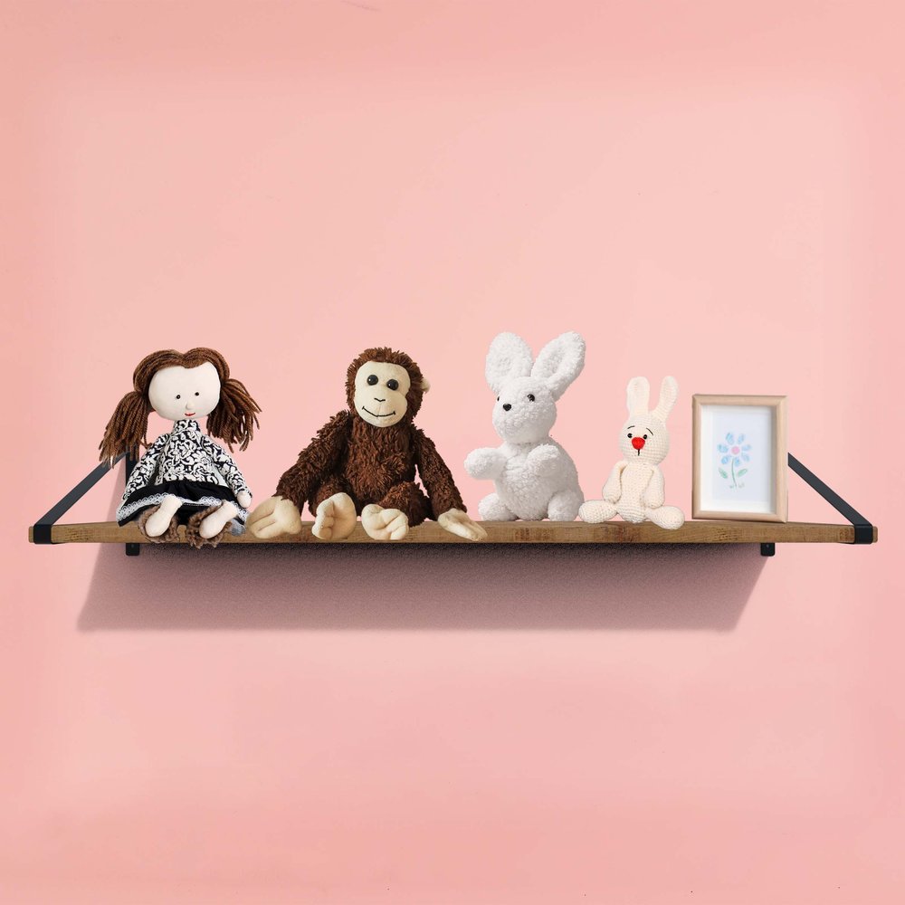 The 8-inch set of two black metal wall mounted shelf brackets offers a stylish solution for displaying your favorite items. Crafted from durable metal, these brackets ensure strength and stability for all your shelving needs. Their industrial style complements various rooms such as the living room, bedroom, bathroom, and office, enhancing your decor with a modern edge. The sleek black finish adds an elegant touch while seamlessly blending with existing furnishings. Elevate your organization and design with these versatile shelf brackets to combine with your own surface to effortlessly combine functionality and style. 8.25-inch h x 7.75-inch w x 0.75-inch d.