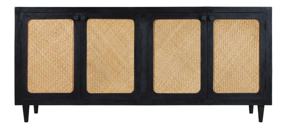 Storage vessels don't have to be unsightly. Increase your storage space and the fashion quotient of your room with this hard wearing, versatile, and good looking cabinet. Crafted from durable solid wood, this sideboard boasts a sleek black finish that enhances its modern appeal. The purposeful distressing adds a charming character, while the paneled door design offers both style and functionality. With ample shelving included, it provides perfect organization for your essentials. The solid wood countertop is ideal for displaying decorative items or serving food, making it a practical addition to any home. 38-inch h x 82-inch w x 18-inch d.