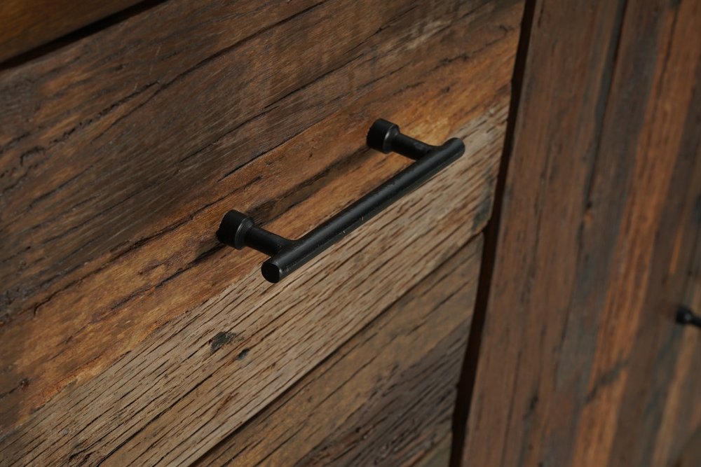 Storage vessels don't have to be unsightly. Increase your storage space and the fashion quotient of your room with this hard wearing, versatile, and good looking cabinet. Crafted from solid mango and reclaimed wood, this sideboard offers a unique charm that highlights its heavily distressed and rustic style. Featuring four cabinet doors, three spacious drawers, and ample shelving, it ensures practicality meets aesthetics seamlessly. The solid wood countertop provides a durable surface for decor, while the sleek black hardware complements the dark brown finish beautifully. 36.00-inch h x 83.00-inch w x 16.00-inch d.