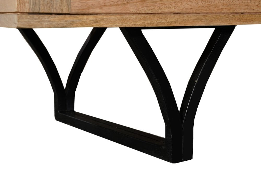Storage vessels don't have to be unsightly. Increase your storage space and the fashion quotient of your room with this hard wearing, versatile, and good looking cabinet. Crafted from solid wood, this sideboard combines durability with timeless elegance. Its beautiful beige finish adds warmth to any decor, while the carved wavy geometric detailing brings an element of sophistication. The spacious shelves provide ample storage for your essentials, making organization effortless. Featuring a modern and contemporary style with a unique design that includes black metal legs that resemble tree branches. 36.00-inch h x 84.00-inch w x 18.00-inch d.
