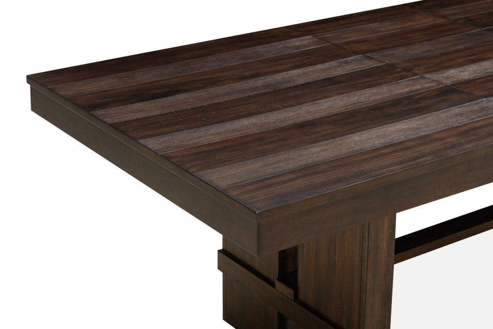 Add handsome, fashionable design to your dining space with this 84-inch dark brown wood self-storing leaf trestle base extension dining table. This table is made from a mix of solid wood and veneers in multi shades of natural and brown. Complete with a purposefully distressed finish, this table has an aged, vintage, and rustic feel. This table features a trestle base that adds some depth and interest to your space. This table is the sturdy, reliable and stylish answer to your dining room needs. This eye-catching dining table is ready for you to enjoy breakfast for one or entertain your guests. 30-inch h x 84-inch w x 42-inch d.