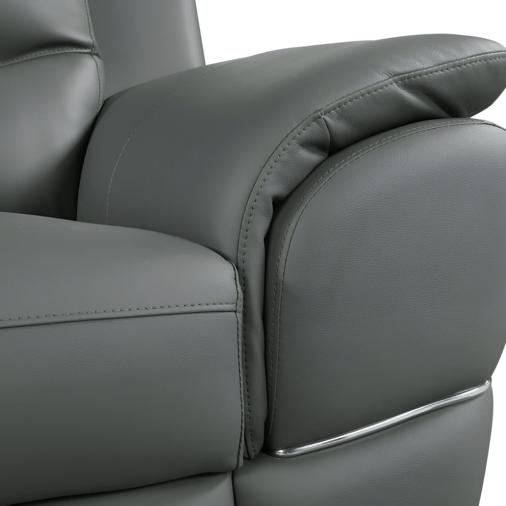 An interior designer's dream, this buttery soft high grade leather 85-inch gray leather sofa with silver legs will bring just the right touch to your space. The premium leather used makes your lounging luxuriously comfortable and adds an elegant appeal to your space. Solid colors give you lots of decorative options and are easy to work into your decor scheme. Sinuous springs construction gives this piece strong support and makes it comfortable to sit even for long periods of time. Pillow top arms offer a comfy place to rest. Silver stainless steel legs effortlessly elevate the room and add a touch of contemporary design. A great showpiece for your room, this sofa is a must have. 37-inch H x 85-inch W x 37-inch D