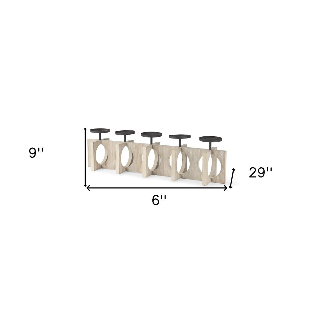 Illuminate any space with this 9-inch black distressed geometric solid wood and metal tabletop pillar candle holder. Handmade by skilled craftsmen and designed to add a glamorous glow to any event or table setting. Add an extra pop of personality to every corner of your home with this gorgeous candleholder candleholders are a decorative accent on their own. With our without candles. 9-inch h x 29-inch w x 6-inch d.