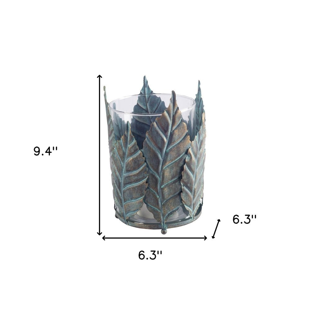 9" Green And Gold Distressed Botanical Leaf Metal And Glass Tabletop Hurricane Candle Holder