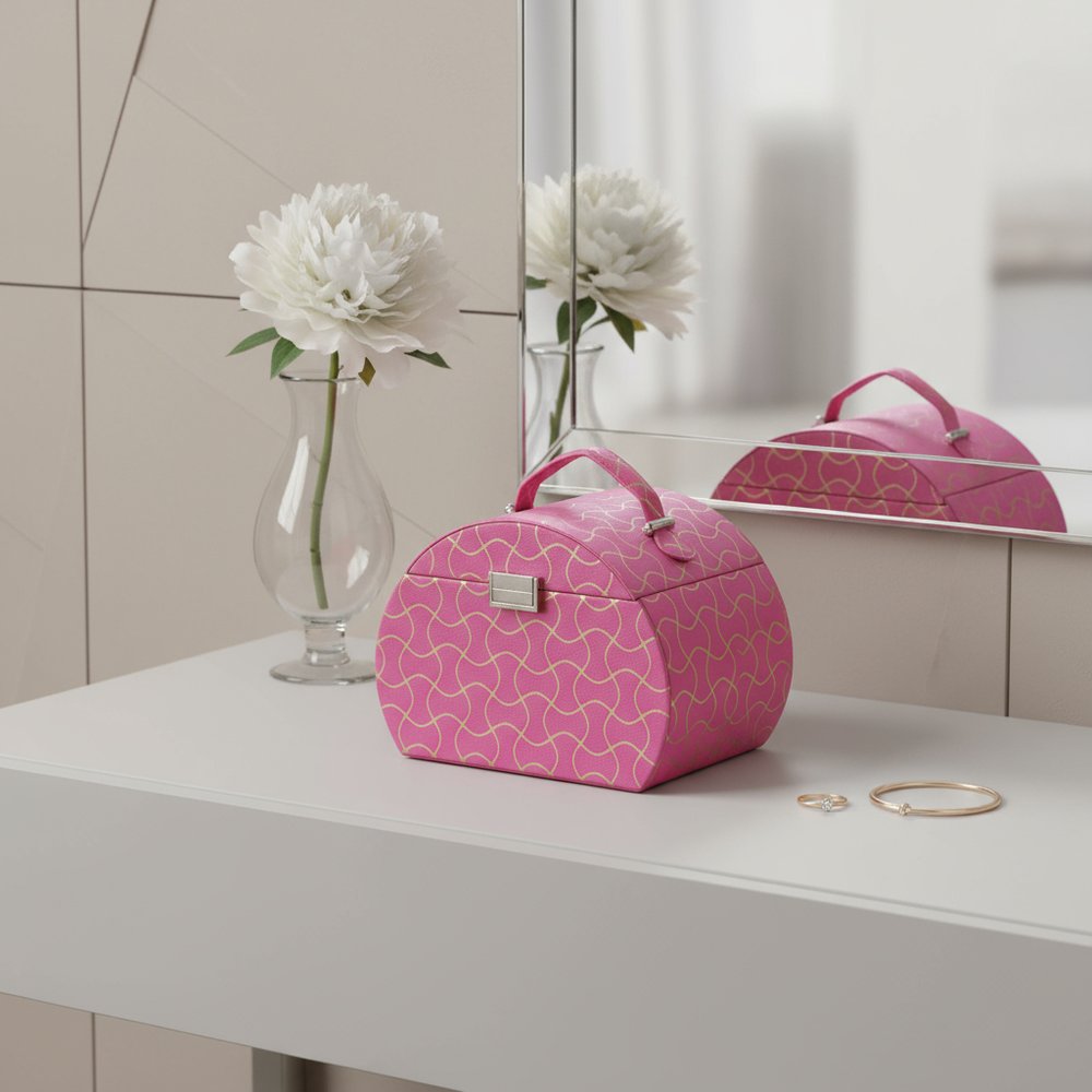 9" Hot Pink And Gold Faux Leather Abstract Scroll Jewelry Box Travel Case With Mirror