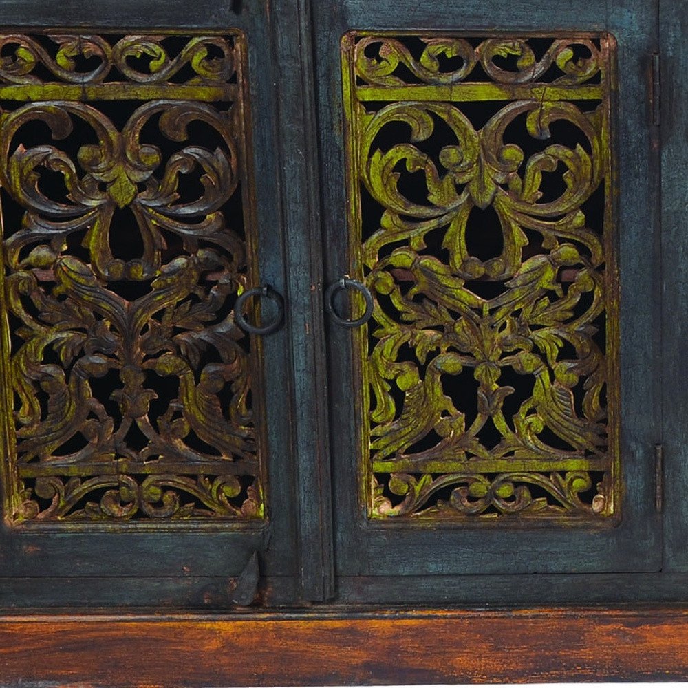 Storage vessels don't have to be unsightly. Increase your storage space and the fashion quotient of your room with this hard-wearing, versatile, and good-looking cabinet. Crafted from solid wood, this buffet table features shelves included for organization. The rich tones of brown, gray, and green add depth and character to your living space. Its sturdy construction and solid wood countertop ensure durability and functionality. Elevate your decor with this stylish sideboard that seamlessly blends style and practicality, making it a perfect addition to any room in your home. 36-inch H x 91-inch W x 16-inch D
