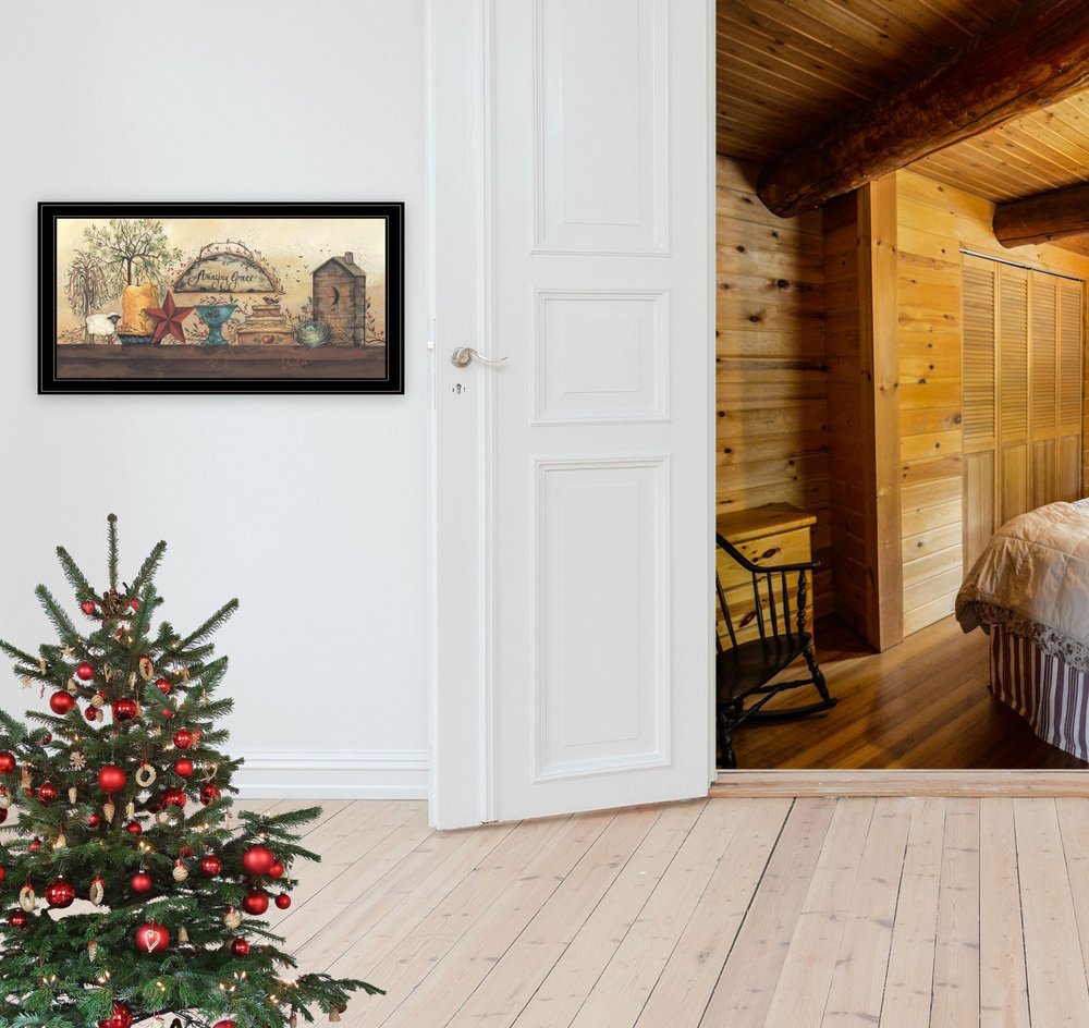 The amazing grace shelf 2 black framed print wall art is the perfect decorative accessory for your home. This print is a visual artistic expression that allows you to decorate your space in style. Reproduced for you on paper, this hanging decorative accent will be a trendy and fashionable way to dress your walls. Adding this hanging wall art to your space to make your room feel more finished and attractive. Instantly liven up your space with this art that brings color and dimension to your walls. 19-inch H x 37-inch W x 1-inch D