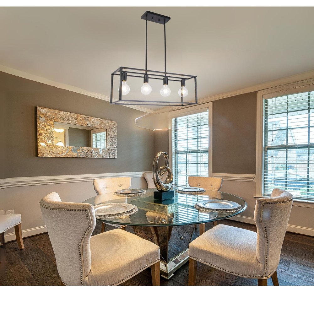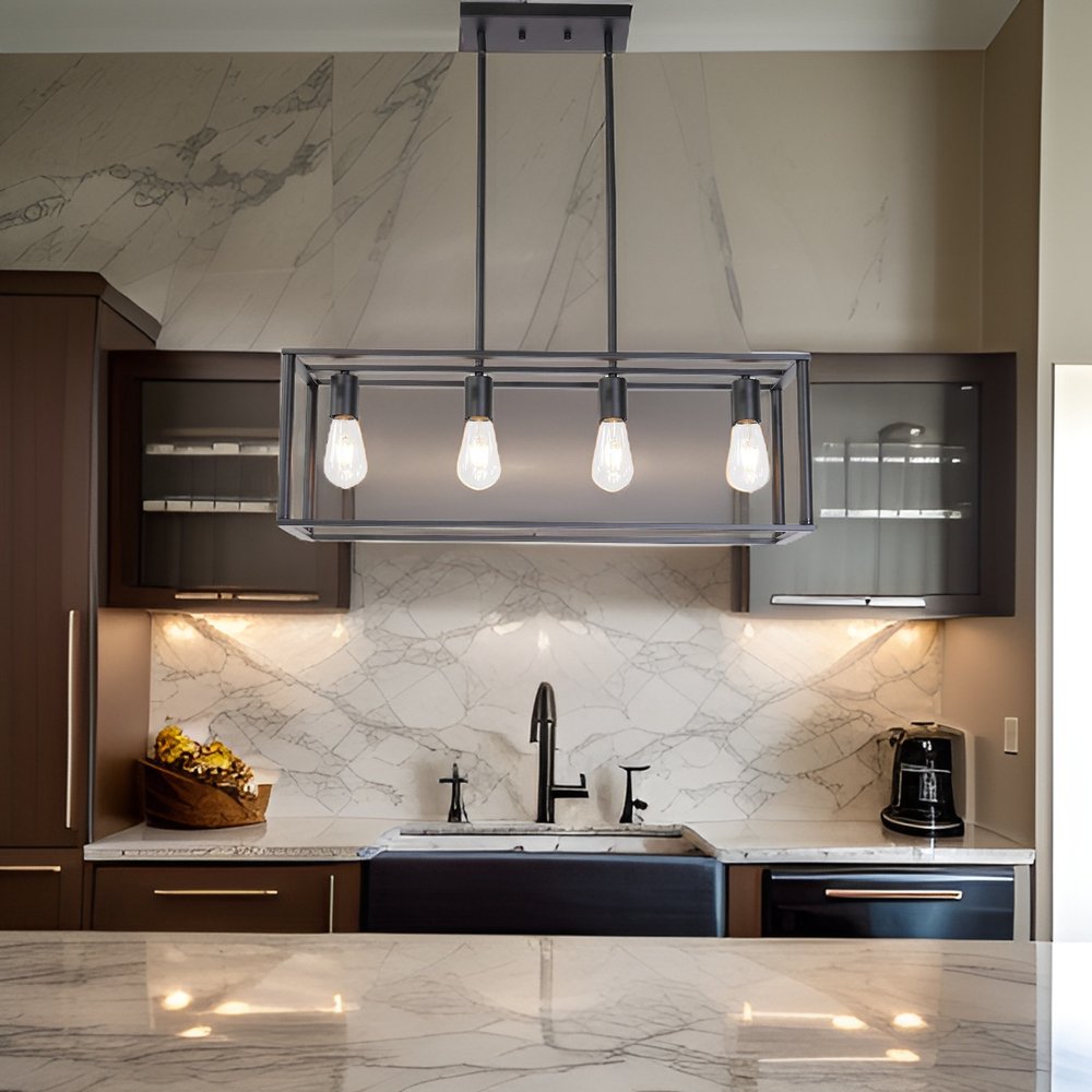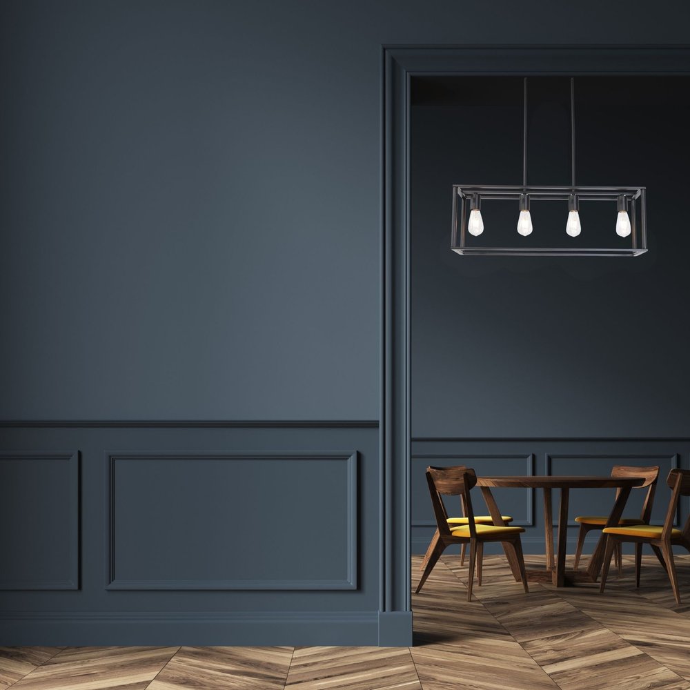 Brighten up your space with this gorgeous black metal four light caged rectangular hanging pendent light. With its black finish, this light fixture gives off a modern and updated vibe that can blend with industrial design or even modern farmhouse decor. A great light for kitchen, dining room, foyer, lobby, lounge, or bar. This fabulous hanging light is a great way to add some design and brightness to any space in your home. 5.7-inch h x 9.3-inch w x 30.1-inch d.