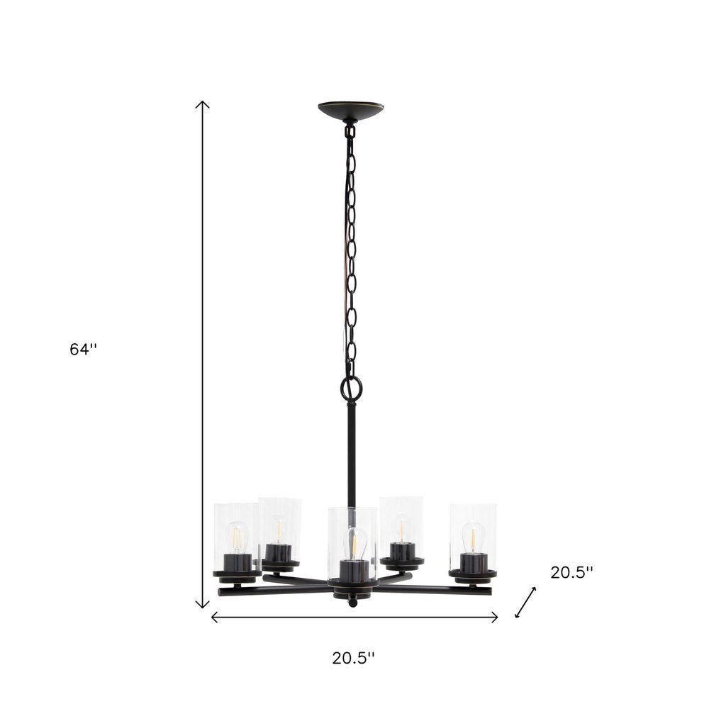 Shed a new light on your space with this illuminating bronze and clear chandelier five light iron ceiling light with clear shades. With its bronze and clear finish, this light fixtue oozes with rich charm. This light will require hardwiring installation. This fabulous hanging light is a great way to add some design and brightness to any space in your home. 64.00-inch h x 20.50-inch w x 20.50-inch d.