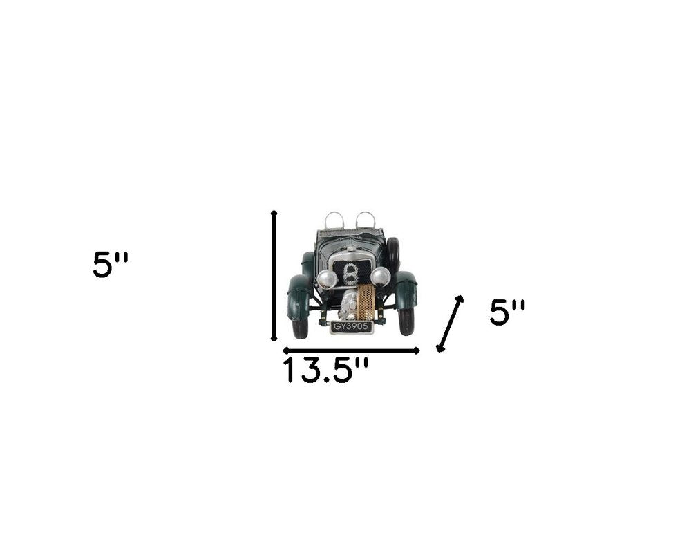 A must have for the collector and enthusiast, this c1930 Bently Blower British Race Car Model Sculpture is made iron and finished in antiqued green color and with a scale of 1:13 is designed to be an authentic looking replica.This unique vintage model is a piece of art that comes complete with unqique details like the supercharger sitting in the front of the car. A great accent for your car enthusiast! 5" x 13.5" x 5"