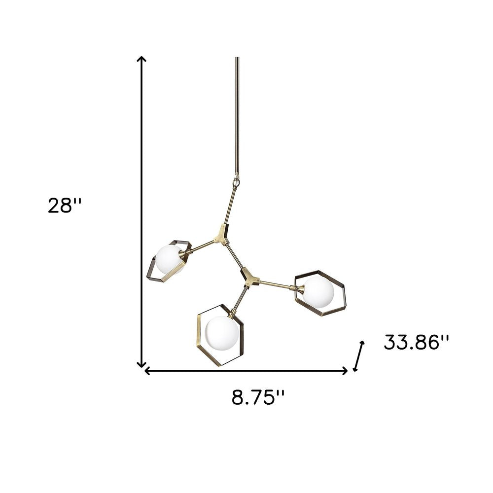 Shed a new light on your space with this illuminating champagne unique statement three light metal and glass dimmable chandelier with white shades. Get creative and change up the look of any room from hallway, to closet, to office or bedroom with this gorgeous hanging chandelier light fixture. With its geometric design, this modern chandelier features a handmade construction and an adjustable hanging length for versatility. The elegant white shades complement the metallic elements gracefully, enhancing any decor style while providing luminous illumination. 28-inch h x 8.75-inch w x 33.86-inch d.