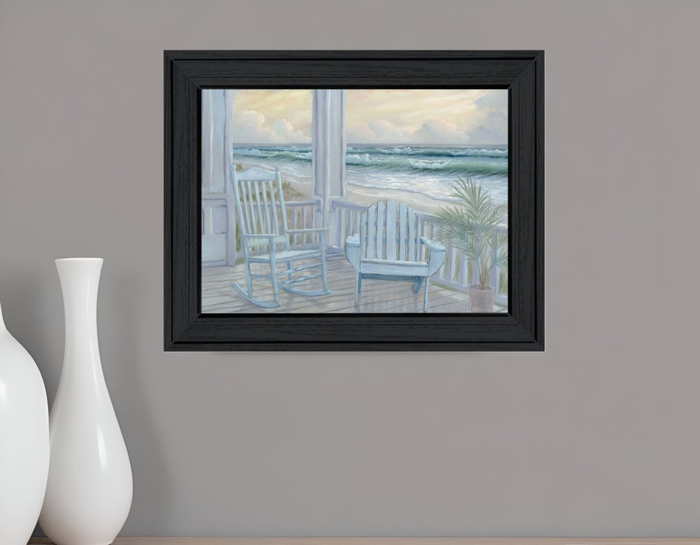 Bring some sizzle to your space with this eye-catching coastal porch black framed print wall art. This print is a visual artistic expression that allows you to decorate your space in style. Reproduced for you on wood, this hanging decorative accent will be a trendy and fashionable way to dress your walls in a rustic and modern farmhouse vibe. Adding this hanging wall art to your space to make your room feel more finished and attractive. Instantly liven up your space with this art that brings color and dimension to your walls. 15-inch H x 19-inch W x 1-inch D