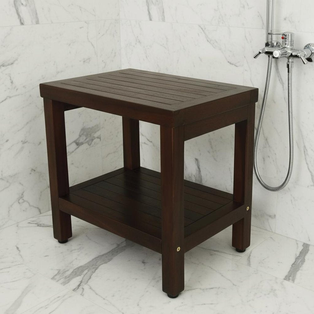 Compact Rectangular Teak Shower Or Outdoor Bench With Shelf In Brown Finish