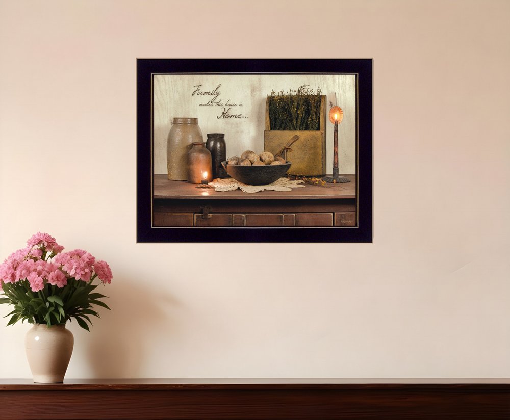 Bring some sizzle to your space with this eye-catching family makes a house a home black framed print wall art. This print is a visual artistic expression that allows you to decorate your space in style. Reproduced for you on paper, this hanging decorative accent will be a trendy and fashionable way to dress your walls. Hang on your wall to add some up to date fashion and decoration. Utilize this opportunity to create a focal point in the room with this fabulous wall decor option. 14-inch H x 18-inch W x 1-inch D