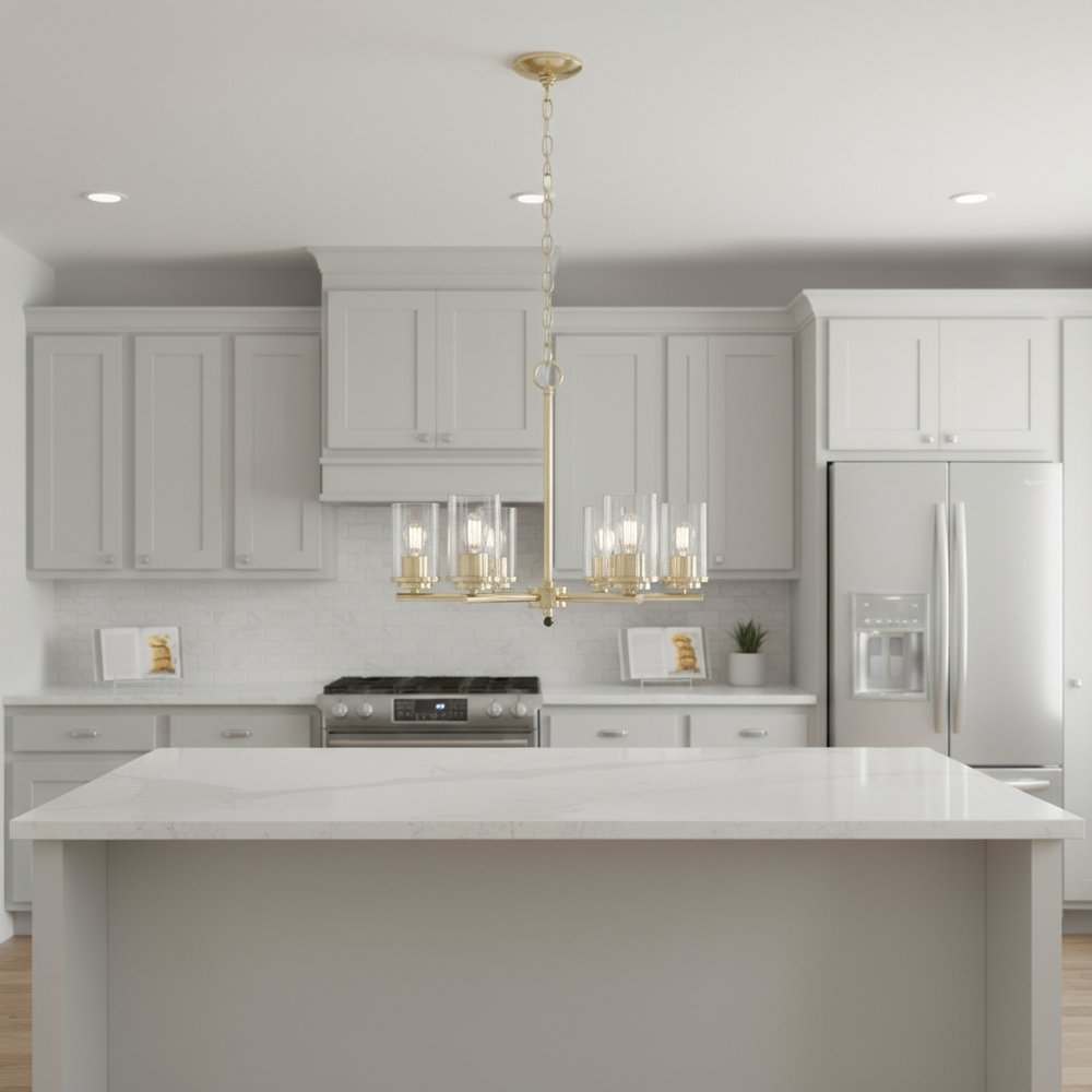 Dress up your entryway, dining room, kitchen, or bedroom with this gold and clear chandelier five light iron ceiling light with clear shades. With its gold and clear finish, this light fixtue oozes with rich charm. This light will require hardwiring installation. This fabulous hanging light is a great way to add some design and brightness to any space in your home. 64.00-inch h x 20.50-inch w x 20.50-inch d.