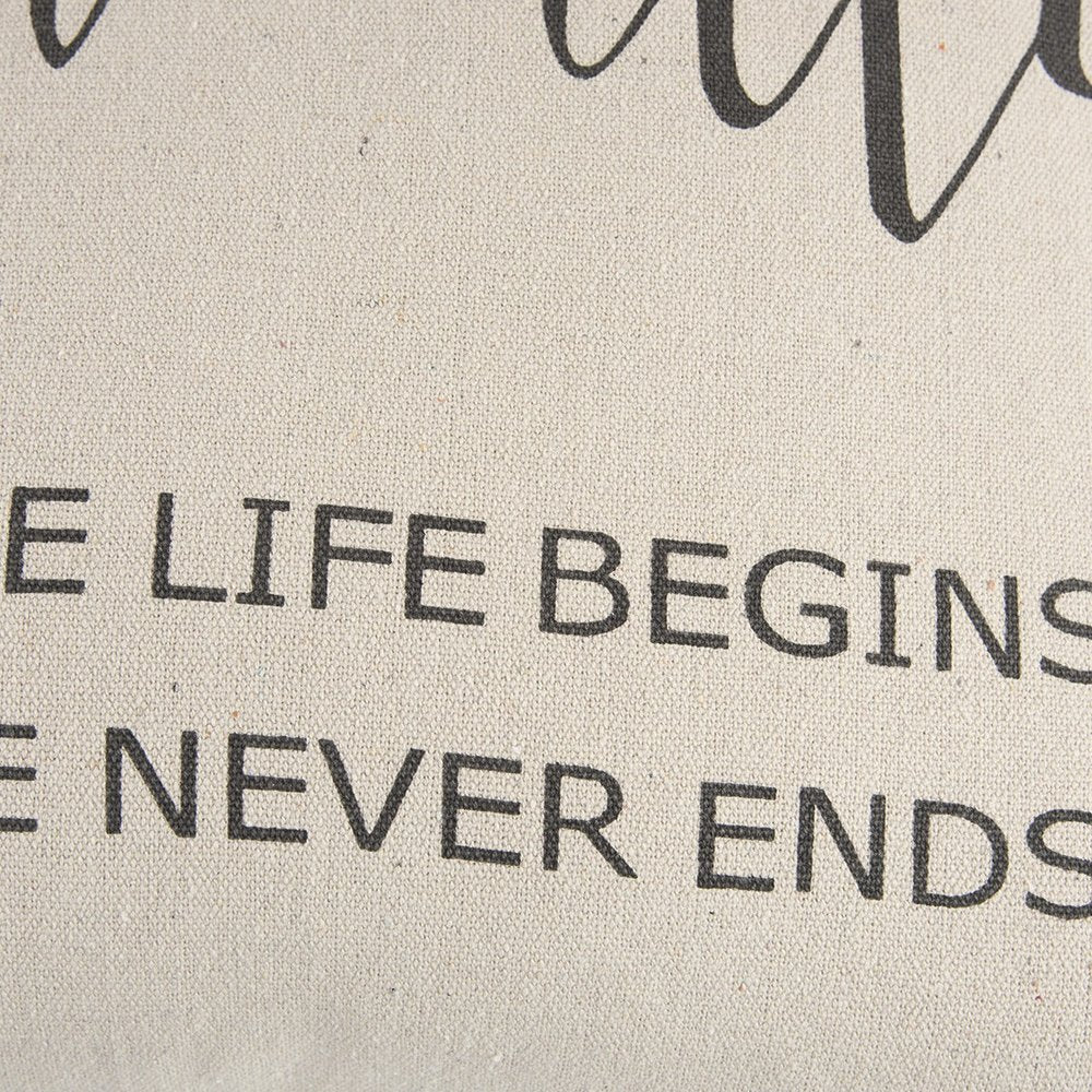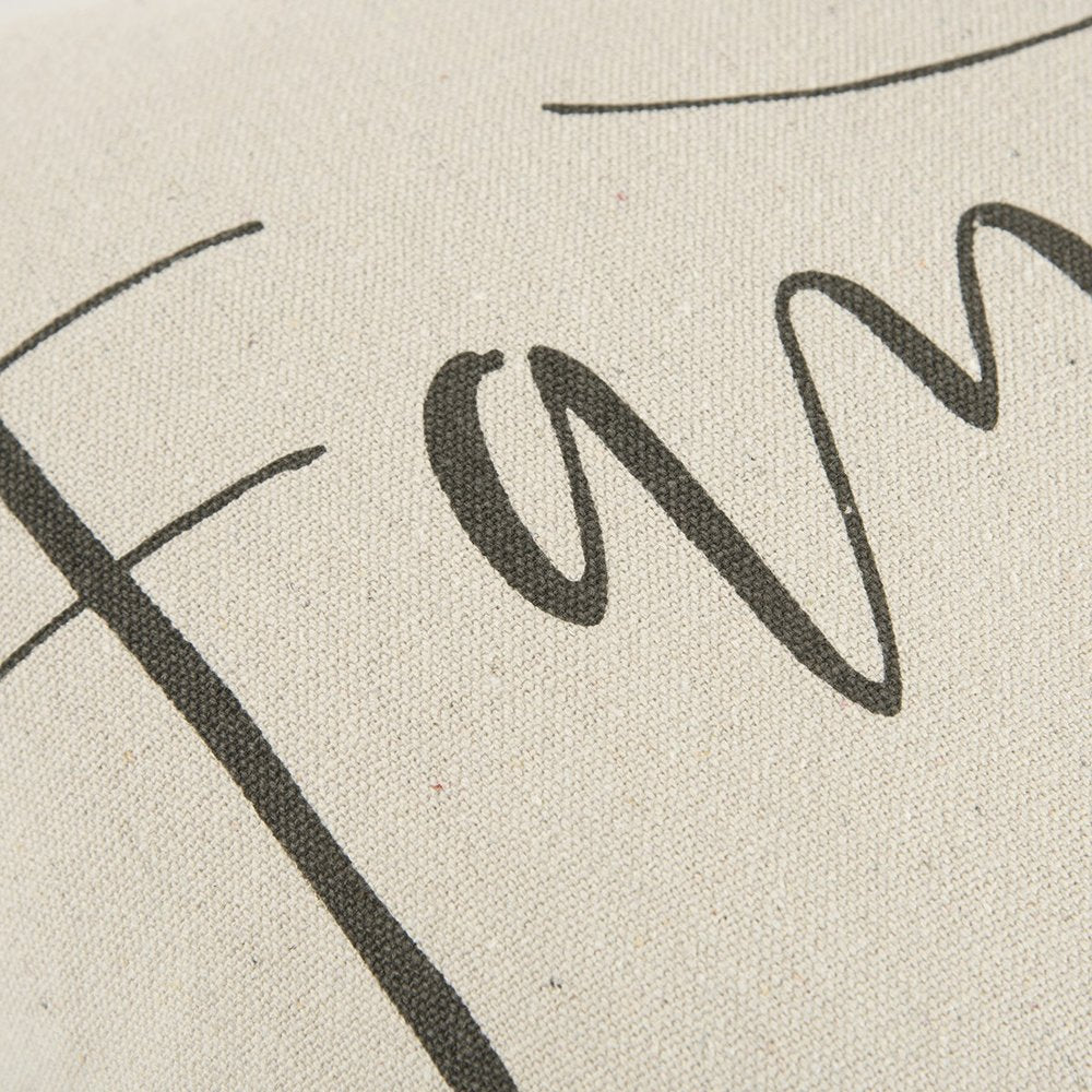 Express the importance of family with this Gray and Cream Canvas Family Love Throw Pillow that features a sophisticated color palette and sentimental words to add character to your living space. The beautifully tailored modern font with an emotional statement "Family Where Life Begins & Love Never Ends” signifies the value of family in our lives. The gray fonts are perfectly balanced over the cream base for a simple yet stylish visual appeal while the knife edging makes the pillow suitable for all types of interior design styles and decors. The pillow features lightly textured cotton canvas for a luxurious feel on the touch. The hidden zipper closure on the cotton back ensures easy filling and cleaning. Embracing style and simplicity in a compact design, this decorative throw pillow will be a functional accent piece to adorn your living room. 20” x 20” x 6.25”