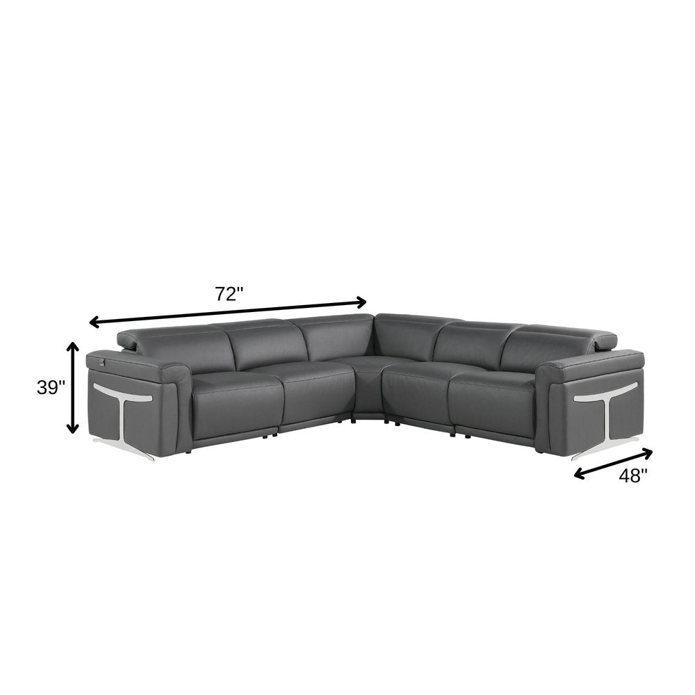 Made of the highest quality, supple leather, this gray Italian leather modular l shaped five piece corner sectional will be the star of your space. The high-grade premium leather used makes your lounging luxuriously comfortable and adds an elegant appeal to your space. Solid colors give you lots of decorative options and are easy to work into your decor scheme. Flared arms offer a comfy place to rest. Power - push button recline allows you to truly rest, lounge and even sleep comfortably. Add versatility to your room as this sectional opens up into a n/a sleeper bed. Silver metal legs effortlessly elevate the room and add a touch of contemporary design. A great showpiece for your room, this sectional is a must have. 39-inch h x 72-inch w x 48-inch d.