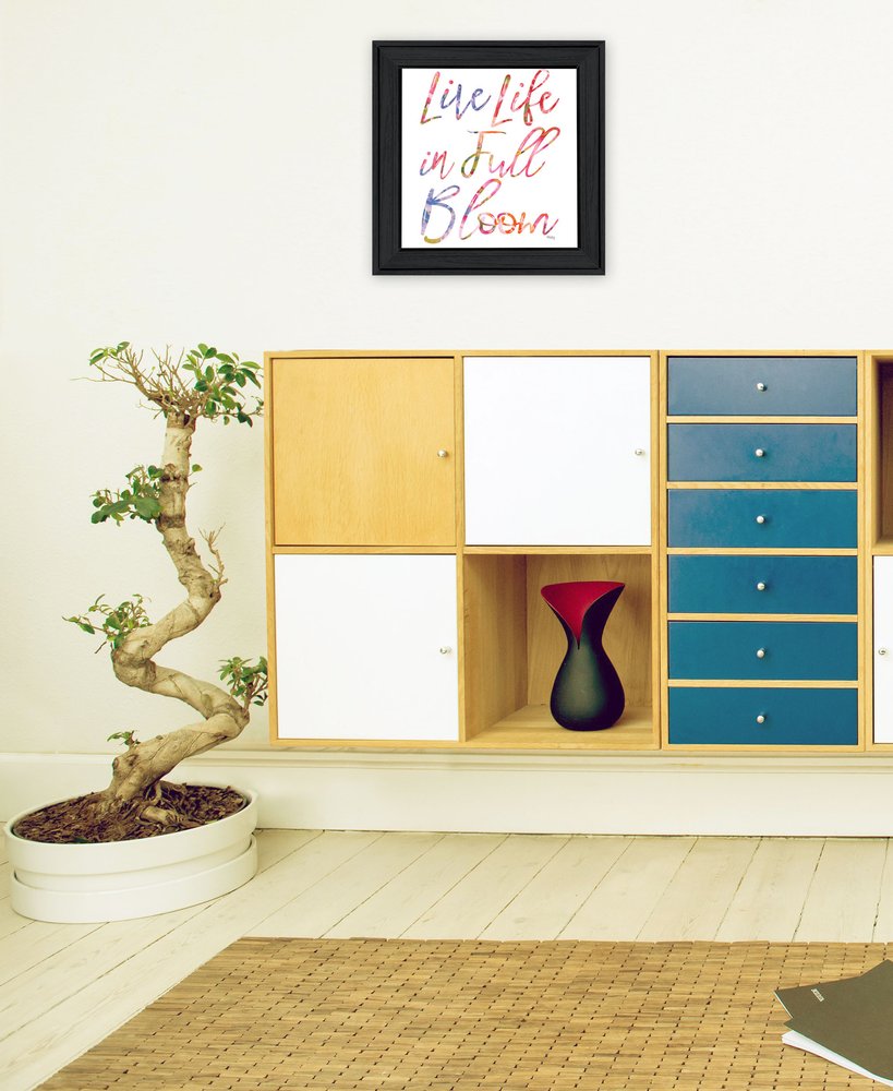 Bring some sizzle to your space with this eye-catching live life in full bloom black framed print wall art. This print is a visual artistic expression that allows you to decorate your space in style. Reproduced for you on wood, this hanging decorative accent will be a trendy and fashionable way to dress your walls in a rustic and modern farmhouse vibe. Hang on your wall to add some up to date fashion and decoration. Utilize this opportunity to create a focal point in the room with this fabulous wall decor option. 15-inch H x 15-inch W x 1-inch D