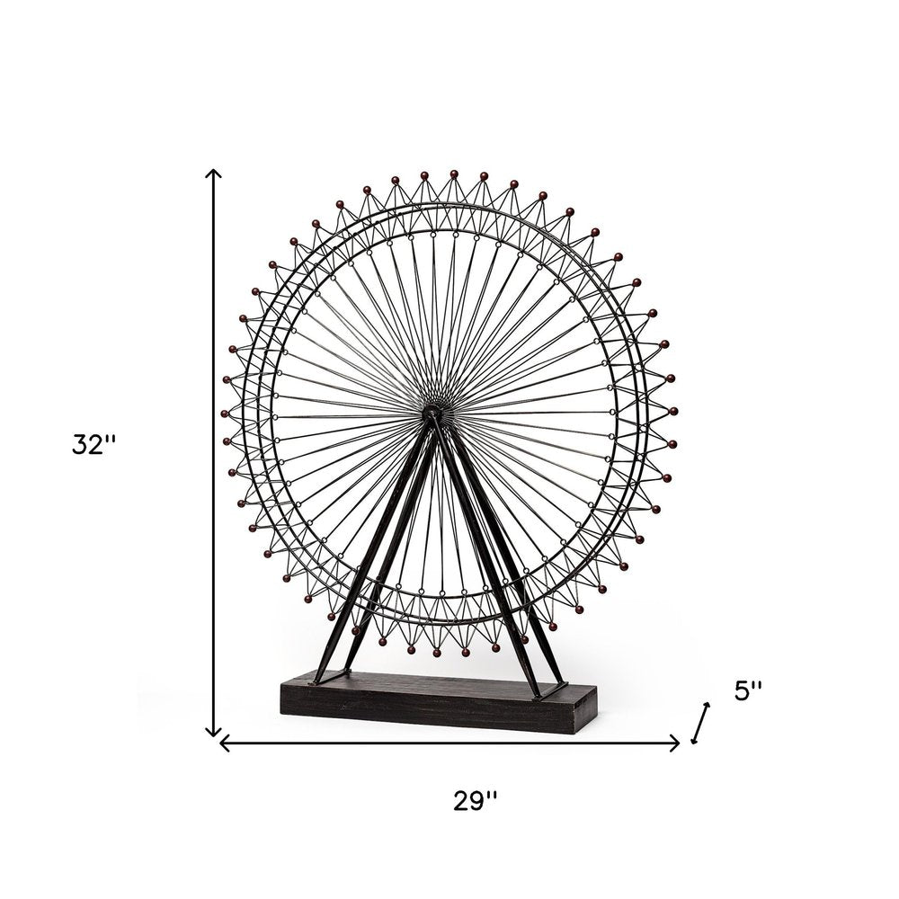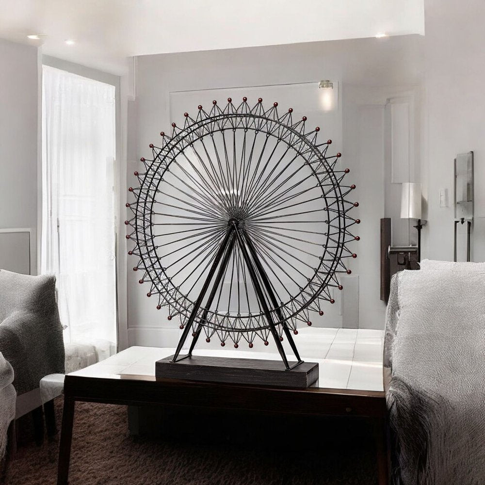 Bring in a touch of global design to your home with this super cool Metal and Wood London Eye Moveable Sculpture. This piece is made from a mix of different materials. The base is made of wood and is in the shape of a rectangular block which is colored to a dark brown finish. Attached to this base there are two metal rods on either side that extend up and meet in the middle of the London eye Ferris wheel shape. The Ferris wheel has three circular shapes that spokes joining in the middle on the inside and triangular spokes on the outside. This decor piece will look great on your bookshelf, your fireplace, or as part of your home office decor. 32" H x 29" W x 5" D