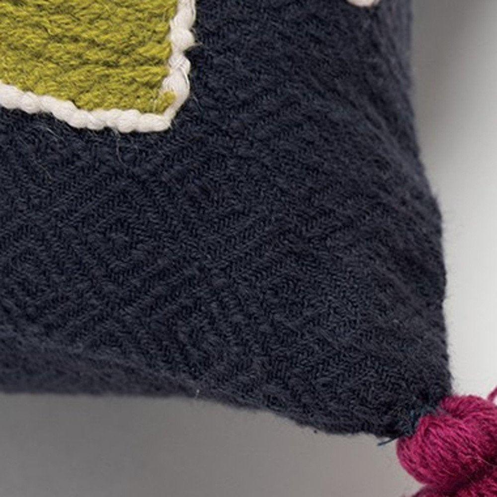 Enliven your living room with this Navy Tribal Motifs Embroidered Throw Pillow that is reminiscent of tribal décor with a bohemian flair. The solid navy blue base host multitude of tactile textures and frayed tribal motifs in eclectic shades of vibrant hues with a central panel in white for added dimension while the multicolored corner tassels accentuate a tribal influence. Crafted with a soft cotton material, the pillow is durable to last long and be the centerpiece in the room. The same cotton material is featured on the back with a hidden zipper closure for convenience while the polyfill insert ensures a soft and fluffy nature for maximum comfort. The pillow is knife-edged with heavy embellishments on the surface and beautiful corner tassels, making this throw pillow an eye-catching accent to spruce up your home. 20" x 20" x 6.25”