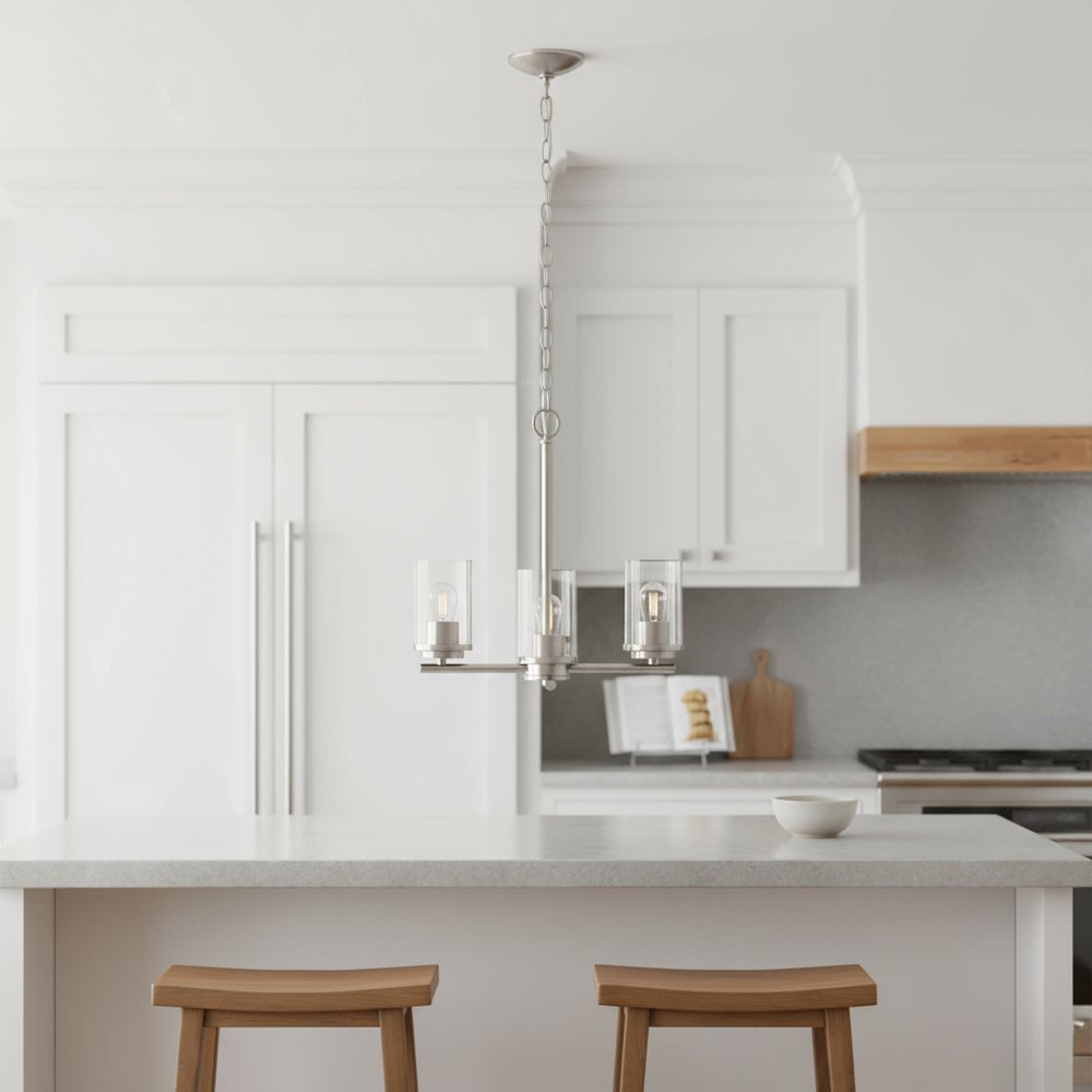 Illuminate your home in style with this nickel and clear chandelier three light iron ceiling light with clear shades. A nickel and clear finish, gives this light a classic and neutral tone to blend into many decor styles. This light will require hardwiring installation. Get creative and change up the look of any room from hallway, to closet, to office or bedroom with this gorgeous hanging chandelier light fixture. 64.00-inch h x 15.00-inch w x 15.00-inch d.