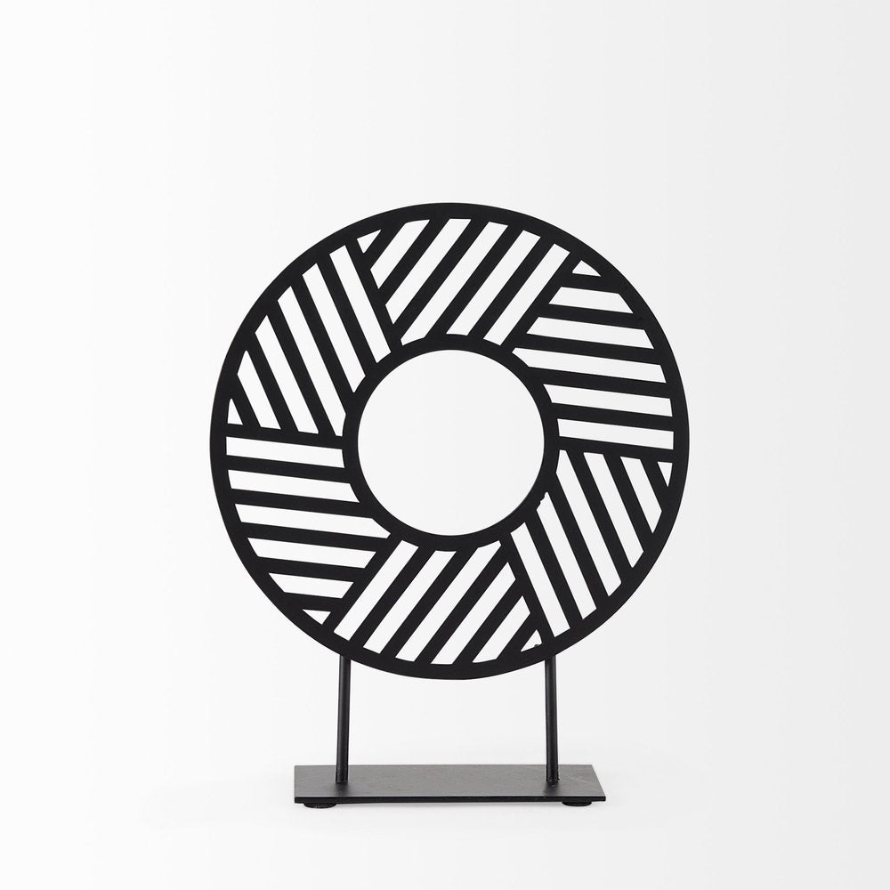 With this Petite Black Metal Round Geometric Sculptureyou can add the perfect touch of art-inspired contemporary design to your home. This smaller sculpture is made from solid metal and features a round shape sitting on a stand in a matte black color. The stand is a thin metal rectangle with two metal rods coming up from it. The circular shape has a hollow round middle with a geometric line design cut out in it. You can display this decor piece anywhere in your home without worrying about clashing colors or interior styles. Use it with similar decor pieces or as a stand-alone piece, it will look great nonetheless. 11" H x 3" W x 9" D