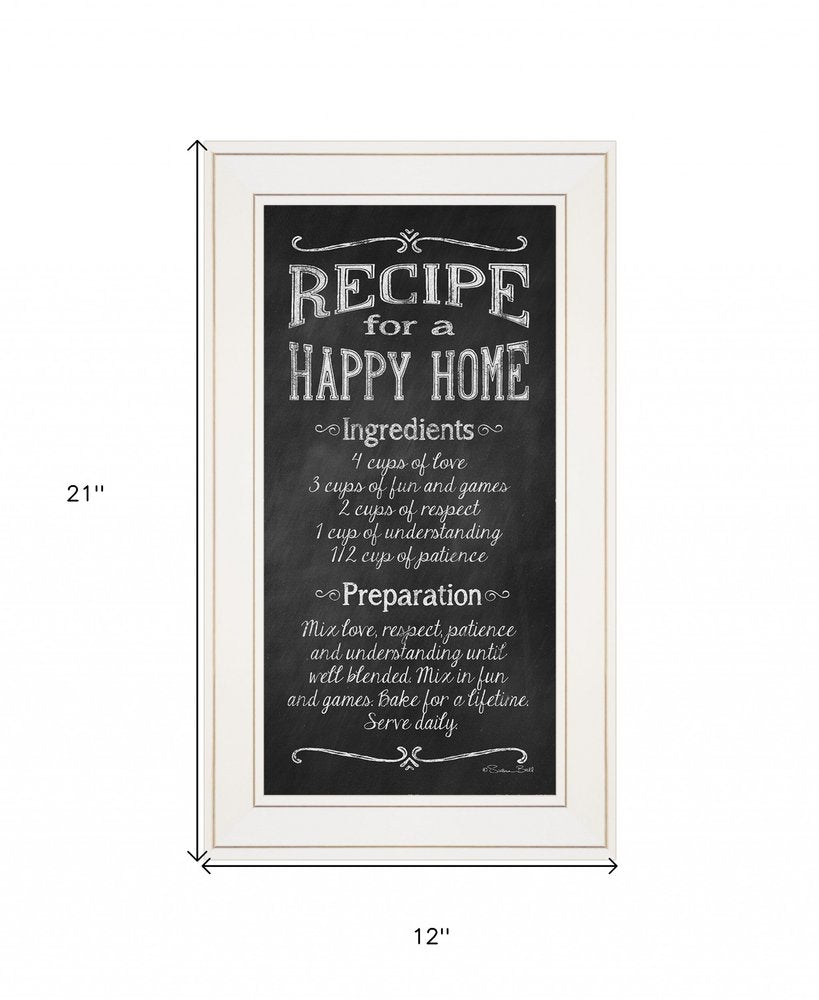 Add an air of fashion to your room and rejuvenate the space with this recipe for a happy home 1 white framed print wall art. This print is a visual artistic expression that allows you to decorate your space in style. Reproduced for you on wood, this hanging decorative accent will be a trendy and fashionable way to dress your walls in a rustic and modern farmhouse vibe. Hang on your wall to add some up to date fashion and decoration. Utilize this opportunity to create a focal point in the room with this fabulous wall decor option. 21-inch H x 12-inch W x 1-inch D