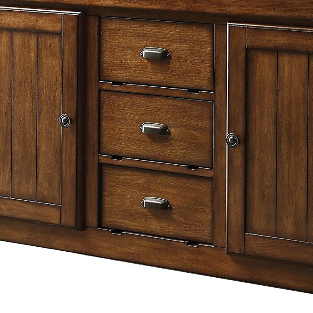 The best way to add extra work space and storage functionality to your kitchen is by including this Rustic Farmhouse Warm Tobacco Rolling Kitchen Cart to the overall setting. The antiqued and distressed warm brown finish is accented with black hardware that gives this cart extra charm. Offering plenty of storage with 3 easy roll out drawers and two cabinets, this cart also has two removeable boards on the top that give it even more functionality. Four locking caster wheels make it easy to move and safe to store in place. A great addition to your kitchen, dining, or living room area this cabinet will add storage and function that looks good and easily blends with most decor. 57" X 22" X 36"