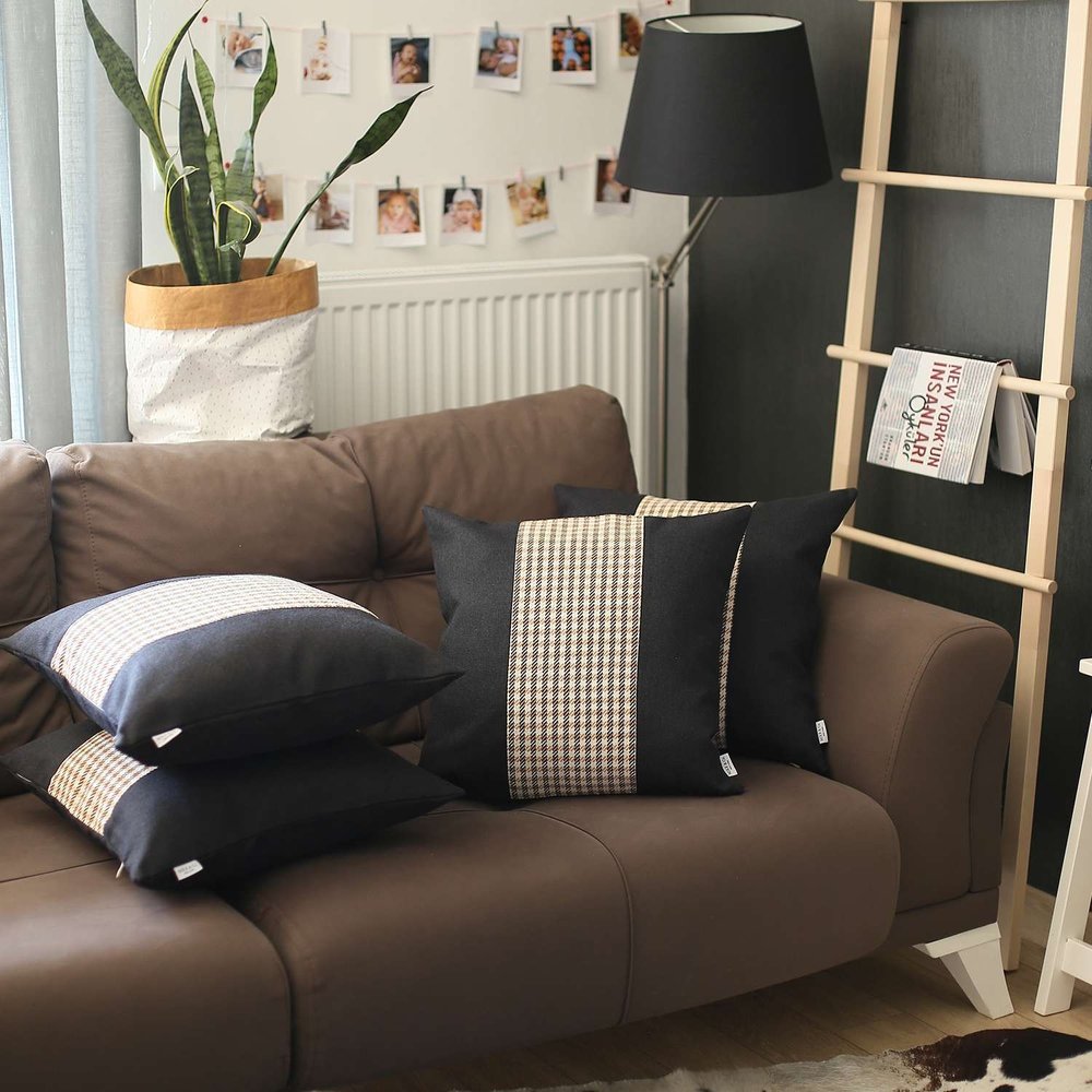 Emphasizing the elegance of modern artistry, this Set of 4 Black and Tan Houndstooth Pillow Covers will induce a rich and luxurious appeal to your contemporary living space. The matte black surface flanking a midsection with tan and white jacquard weaved houndstooth pattern to elevate the entire look for visual contrast. Skilfully handcrafted in Turkey with OEKO-TEX Standard 100 certified polyester fabric to ensure high product safety and durability. This pillow cover should only be spot cleaned to keep its shine for years to come. For a seamless unified finish on the touch, the covers sport an all-around hidden zipper closure. This classic set of 4 pillow covers will effortlessly blend in your modern household and align with your sense of interior styling. 18” x 18” each. Set of 4.