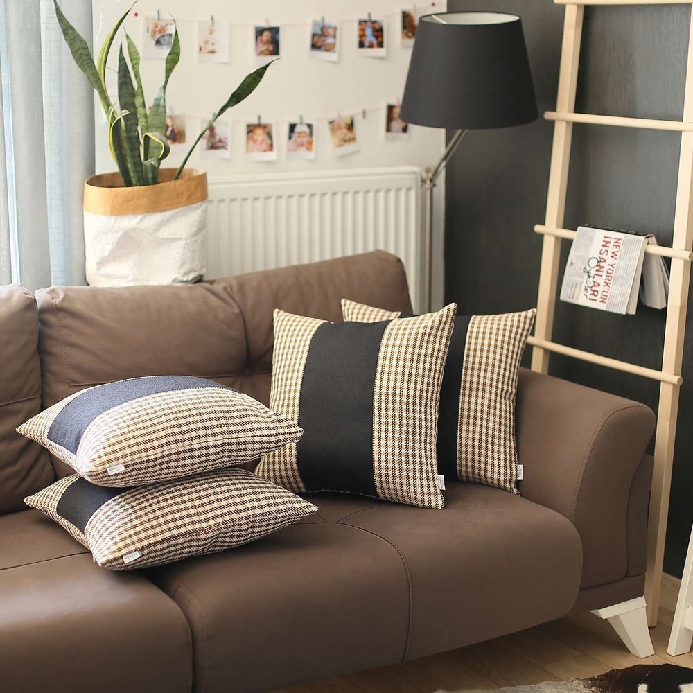 Emanating a classic bohemian vibe in a modern color palette, this Set of 4 Tan Houndstooth Pillow Covers will pull off the aesthetics of any contemporary or countryside styling. The classy tan houndstooth pattern in jacquard weaving laid a stylish foundation to flaunt a charcoal black section in the middle. Flaunting the finesse of Turkish craftsmanship, this pillow cover is made of 100% premium polyester to ensure enhanced durability while the OEKO-TEX Standard 100 certification speaks of product safety. The hidden zipper closure provides a neat and seamless look around the edges that feels smooth and luxurious on the touch. Pair this sophisticated set of 4 pillow covers with any neutral or vibrant schemes for an elegant ensemble. 18” x 18” each. Set of 4.