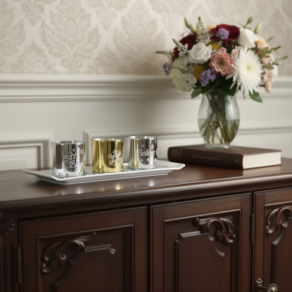 Set of Four Silver Gold And White Snowflake Glass Christmas Tabletop Candle Holders