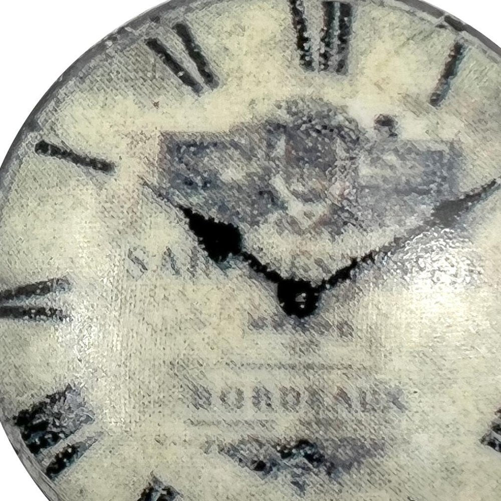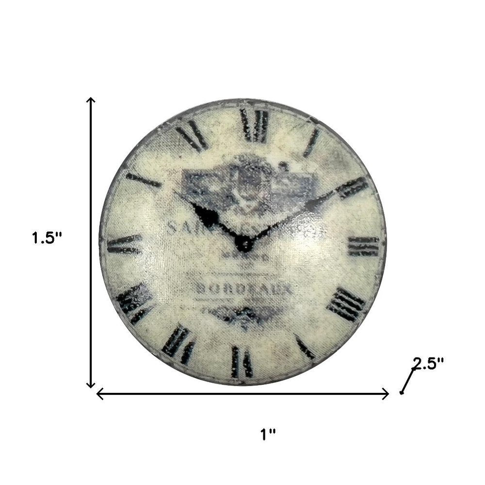 Give your drawers or cabinets a facelift with this set of six black and white clock face ceramic drawer pull knobs. The round knob shape allows for a comfortable grip, enhancing both functionality and style. Crafted from durable ceramic, these knobs showcase purposeful coat and paint distressing, adding character to any furniture piece. Each knob is machine made, ensuring a consistent quality that complements your décor. With screws included, installation is straightforward and hassle-free, making it a perfect choice for a quick upgrade to your home. 1.50-inch h x 1.00-inch w x 2.50-inch d.