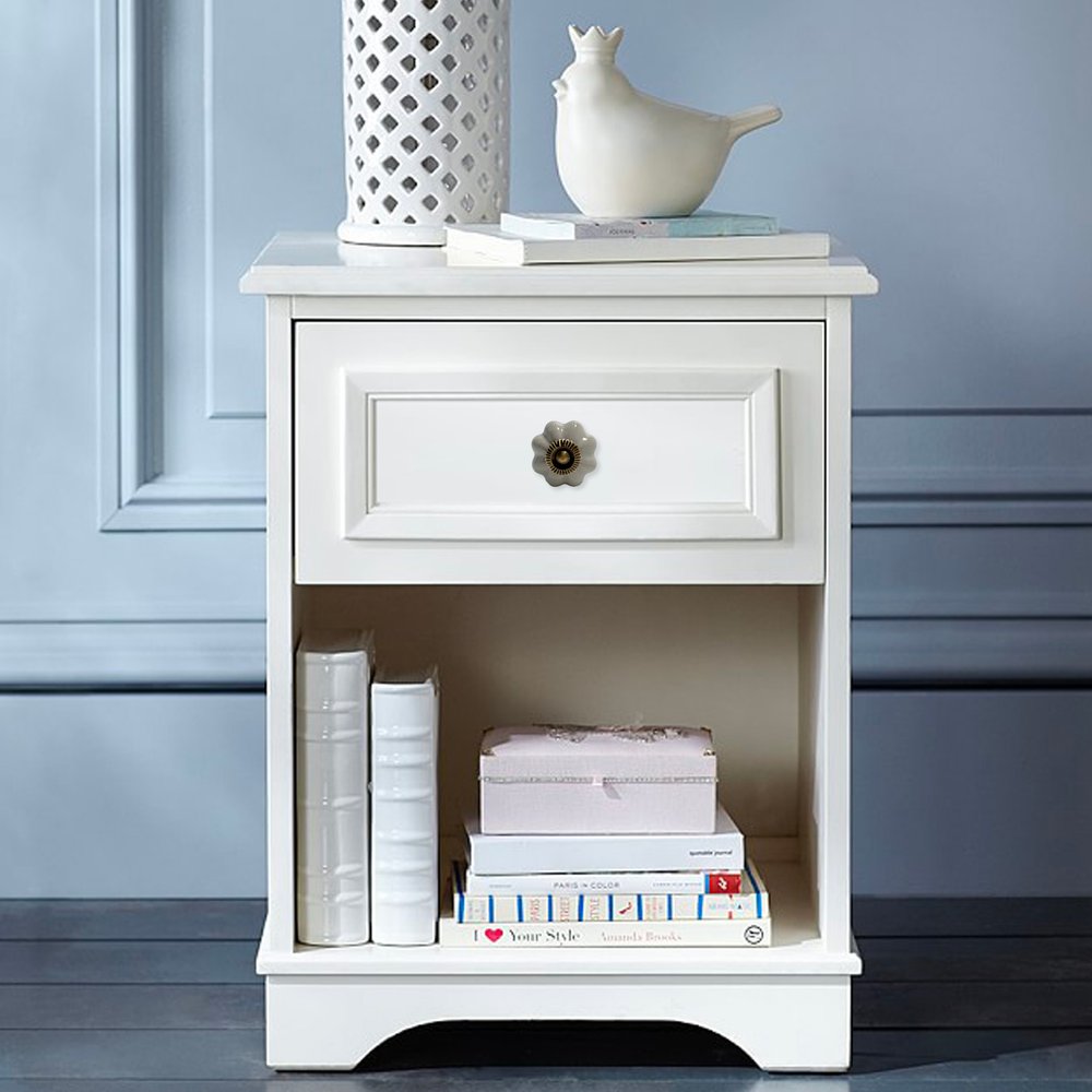 Give your drawers or cabinets a facelift with this set of six gray floral knob ceramic drawer pull knobs. Machine made for precision to add a uniform look and style. Each floral knob showcases a delightful design inspired by nature, bringing a touch of elegance to your furniture. The ceramic material ensures durability while the purposeful coat/paint distressing enhances its unique charm. These knobs come with screws included, making installation easy and straightforward. Transform your space effortlessly with this beautiful floral theme that complements various decor styles. 1.68-inch h x 1.25-inch w x 2.50-inch d.