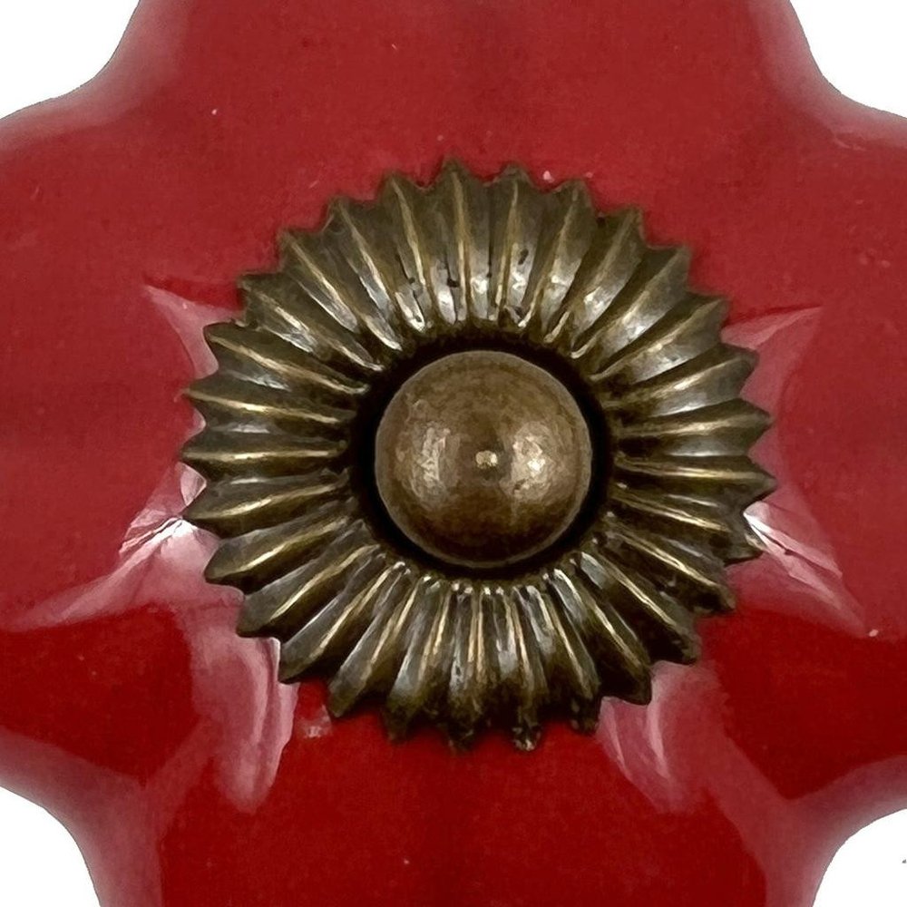 Give your drawers or cabinets a facelift with this set of six red floral knob ceramic drawer pull knobs. Hand-painted by talented artisans, these knobs will add a touch of artisanal design. Each floral knob is crafted from durable ceramic, ensuring a long-lasting and vibrant finish. Designed to be both functional and decorative, they can effortlessly enhance the aesthetic of any furniture. With screws included, installation is simple and hassle-free. Elevate your home decor with these unique and charming knobs that bring a pop of color and character to your space. 1.75-inch h x 1.75-inch w x 3.50-inch d.