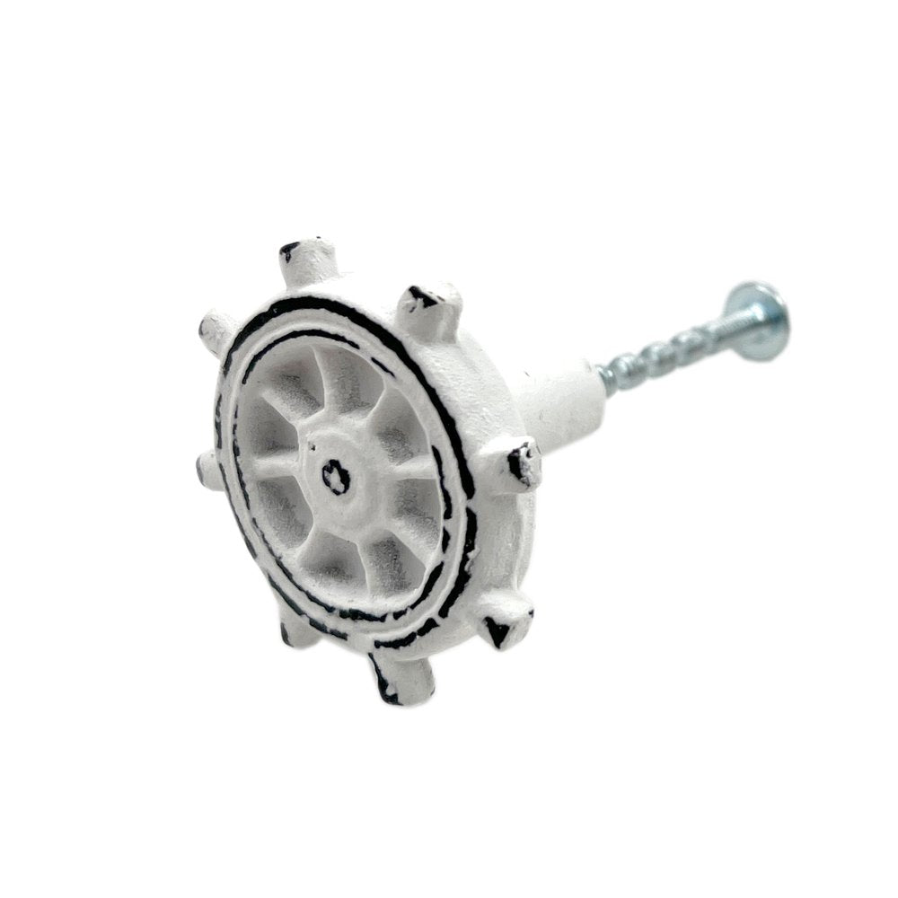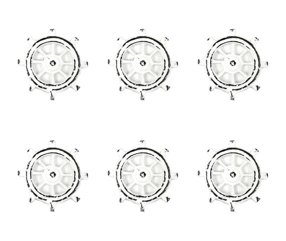 Give your drawers or cabinets a facelift with this set of six white iron drawer pull knobs. Machine made for precision to add a uniform look and style. These round knobs are crafted from durable iron, ensuring long-lasting performance in your home. Each knob features a nautical theme, perfect for adding a touch of coastal charm to your space. The set includes screws, making installation a breeze and ensuring a secure fit. With six knobs included, you can easily update multiple pieces of furniture to create a cohesive and stylish decor theme throughout your home. 1.75-inch h x 1.25-inch w x 2.75-inch d.