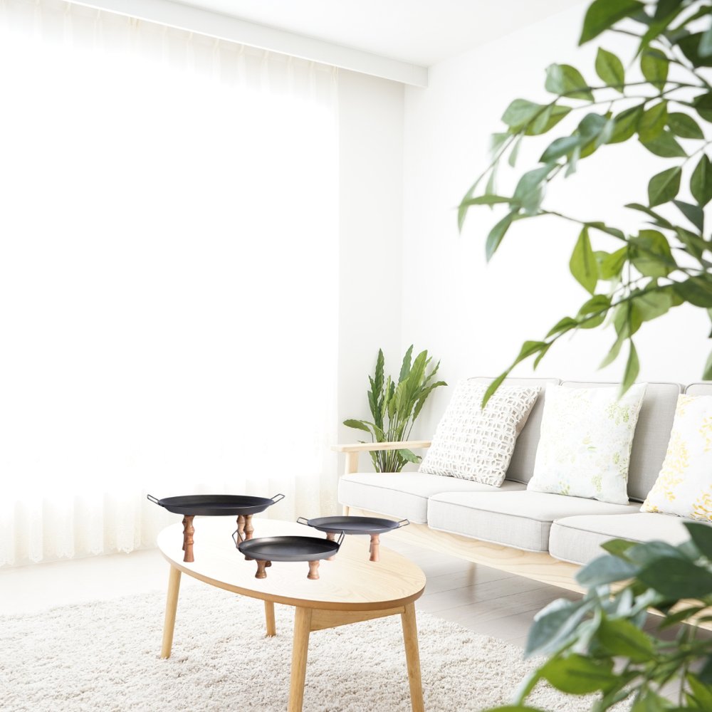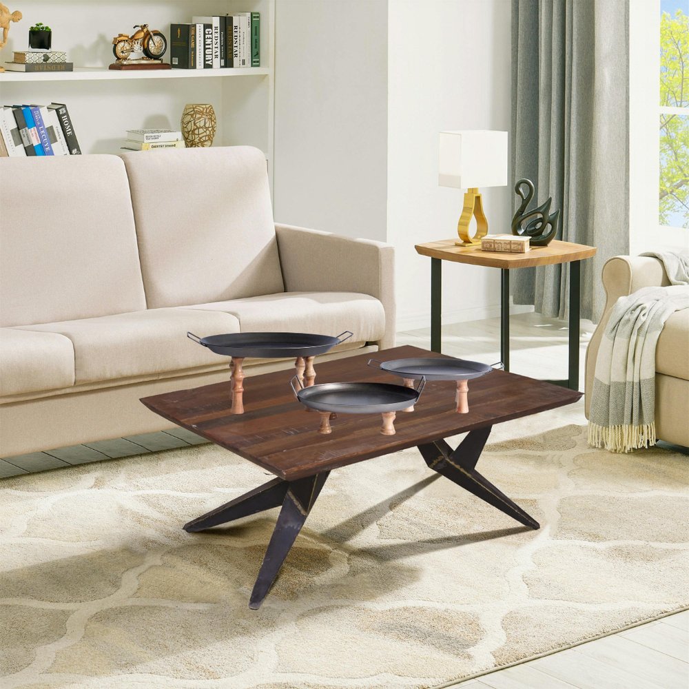 Features handles for quick and easy transportation. Each set comes with three pieces that can be used separately or together. This round riser tray is crafted from a blend of manufactured wood and metal, ensuring durability while maintaining an elegant appearance. The purposeful distressing adds a unique touch, enhancing its transitional style. With a versatile color palette of black and brown, this tray set effortlessly adapts to different settings, providing functionality and aesthetic appeal to your space. 21.5-inch h x 17.25-inch w x 8-inch d.